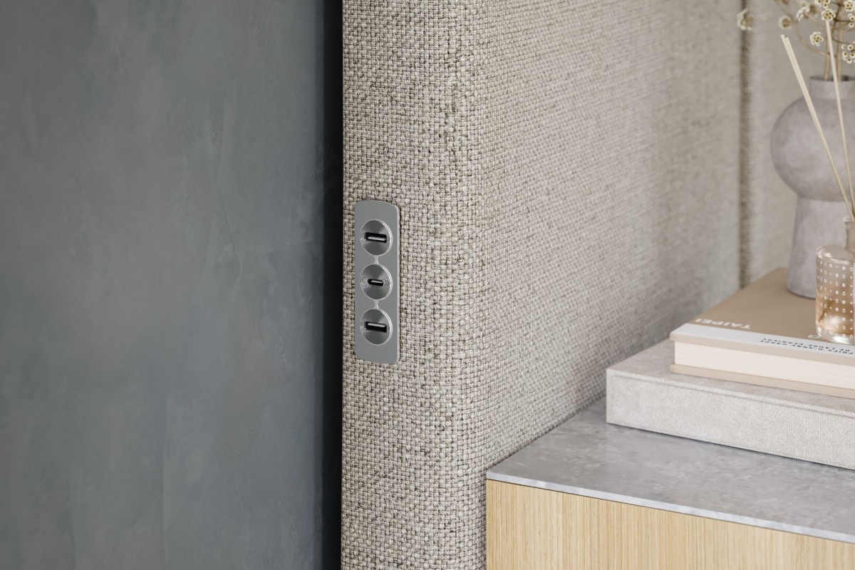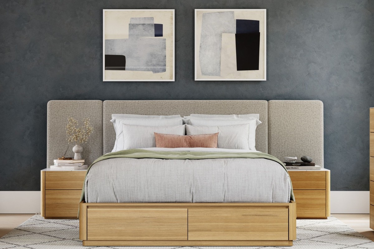 The Elements extended upholstered headboard boasts integrated wing-mounted USB/USB-C charging ports, a versatile floating or gas-lift base. Available in different elegant fabric options.