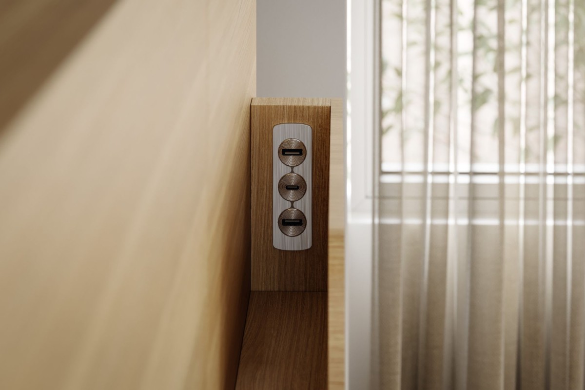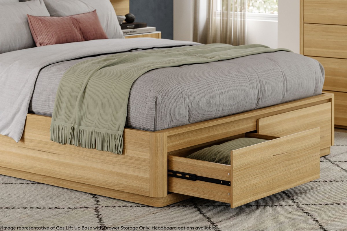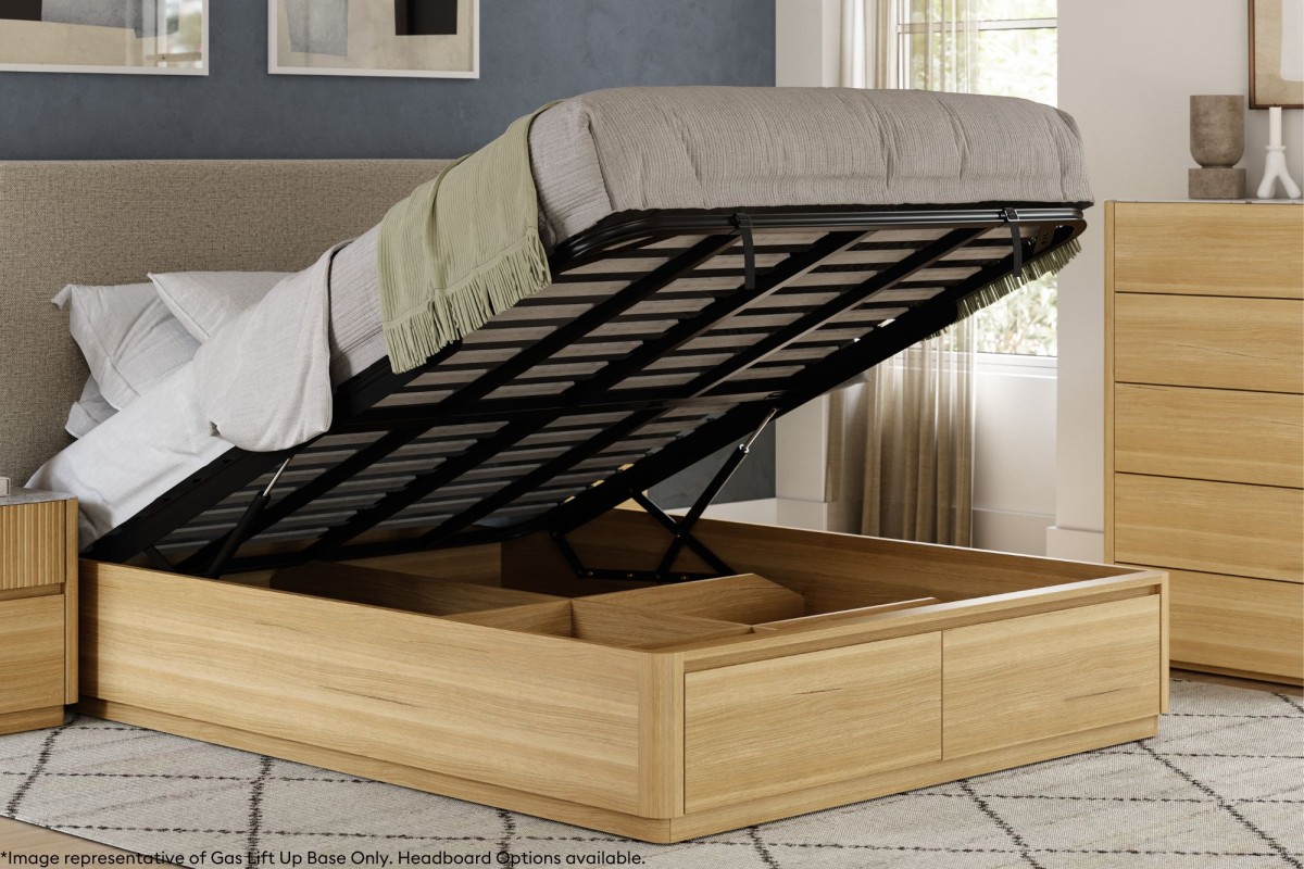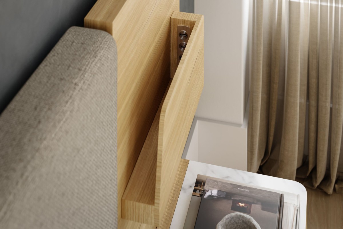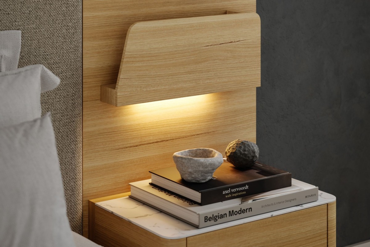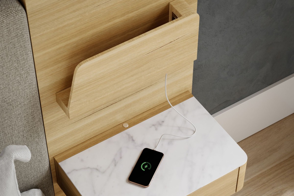 The Elements extended overlay headboard boasts integrated mounted USB/USB-C charging ports,LED lighting,tech shelves, plus a floating or gas-lift base with plenty of storage space. Available in different elegant fabric options.
