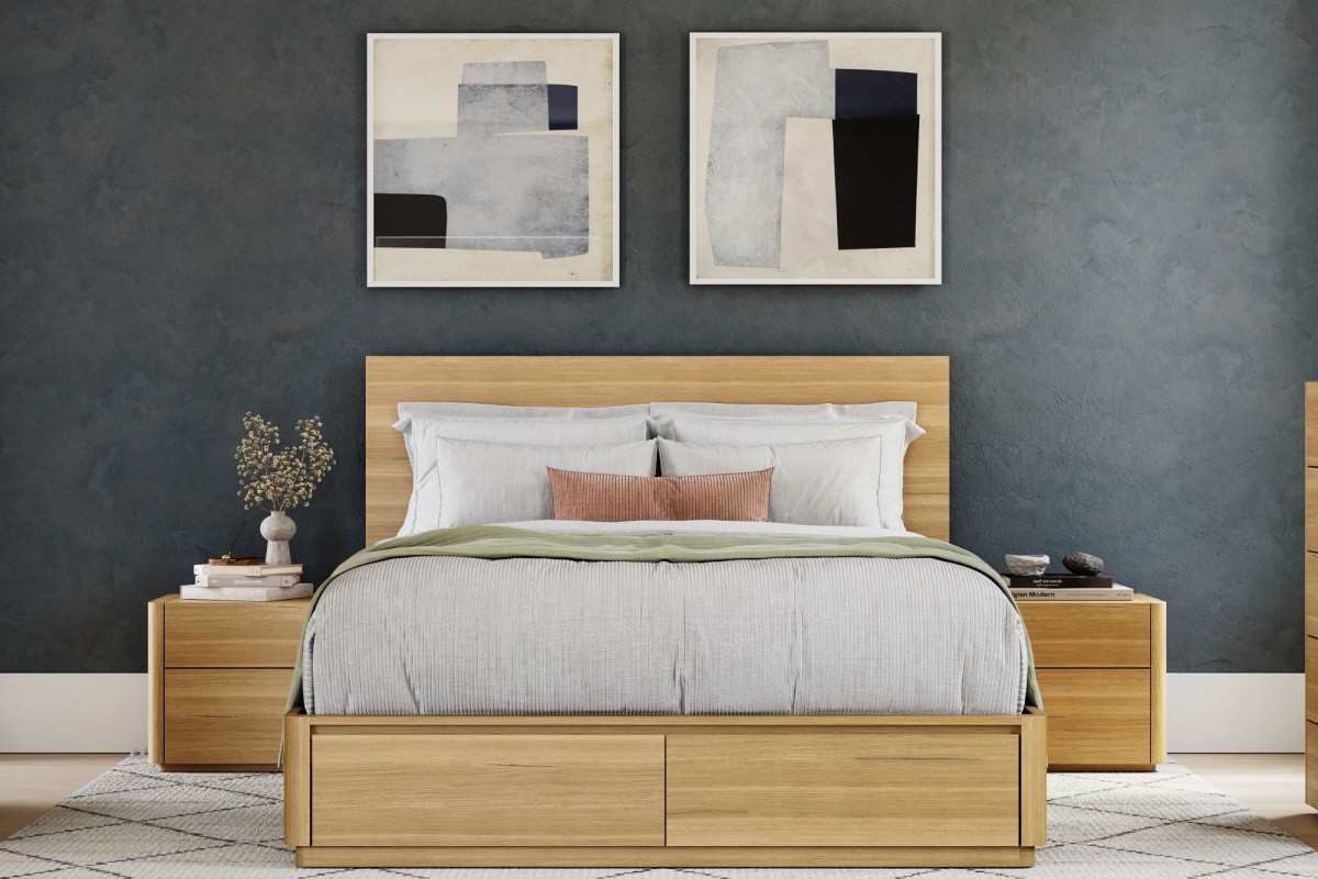 The Elements timber-style headboard is modern in design and incorporates an abundance of standout features that are simple yet captivating and timeless! Two base options available: floating base or gas lift-up base & front drawer storage!
