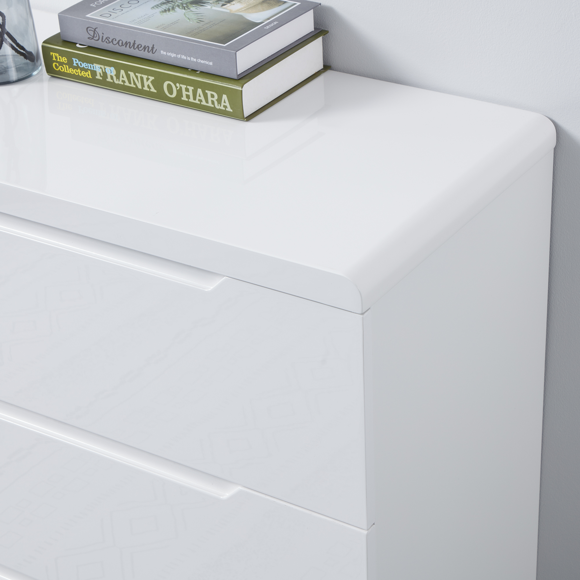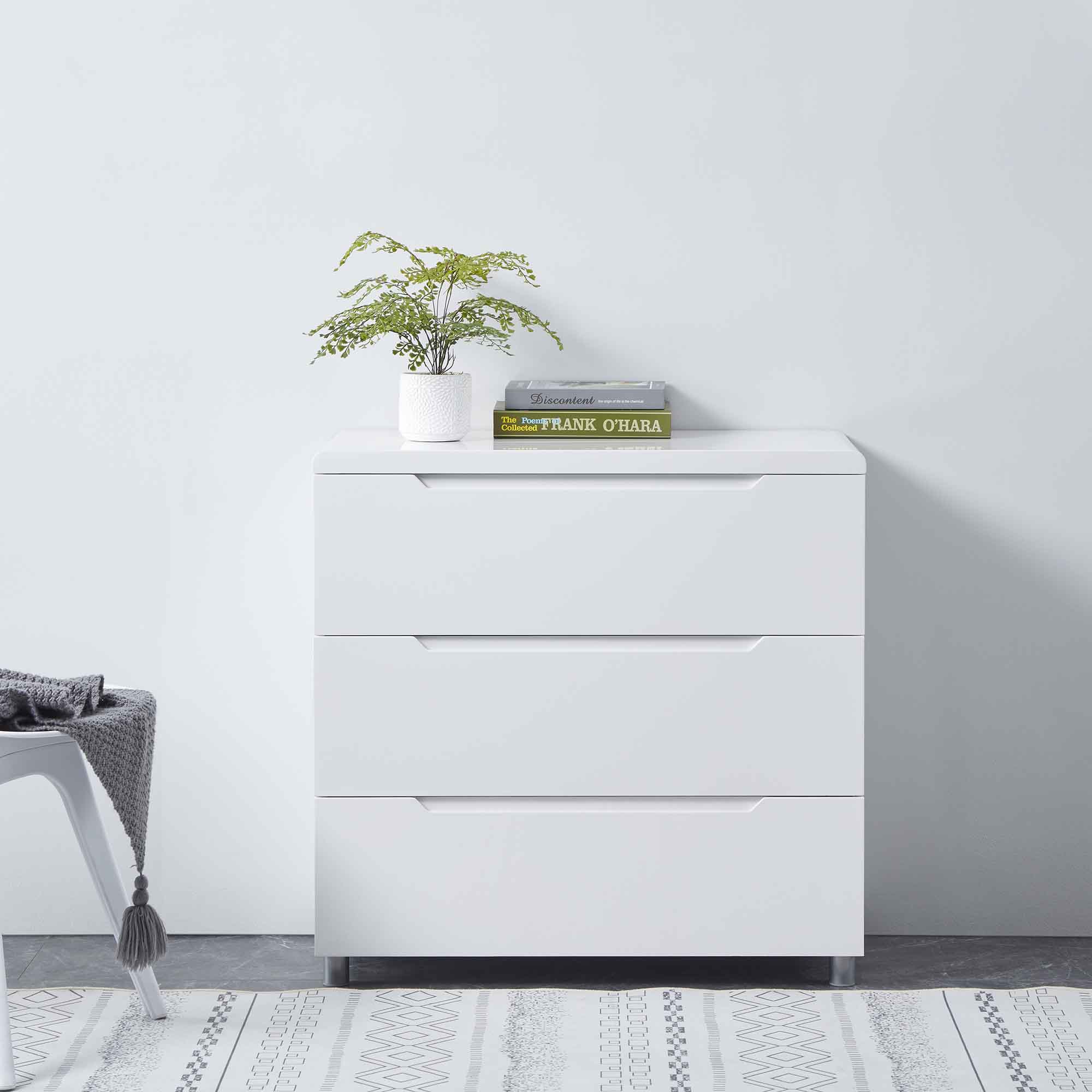 EASY 3 drawer chest features a minimalist yet stylish design with an attractive high gloss finish and smart pearl silver feet. The sturdy frame features spacious drawers with modern grooved cut-out handles for easy access and metal runners for a smooth opening. The flat top surface is great for displaying photo frames, floral bouquets or your favourite ornaments. Ideal for the bedroom, study or living room, the stylish yet practical drawers allow you to organise and store all your goods, from clothes and stationery to crafts and cosmetics.