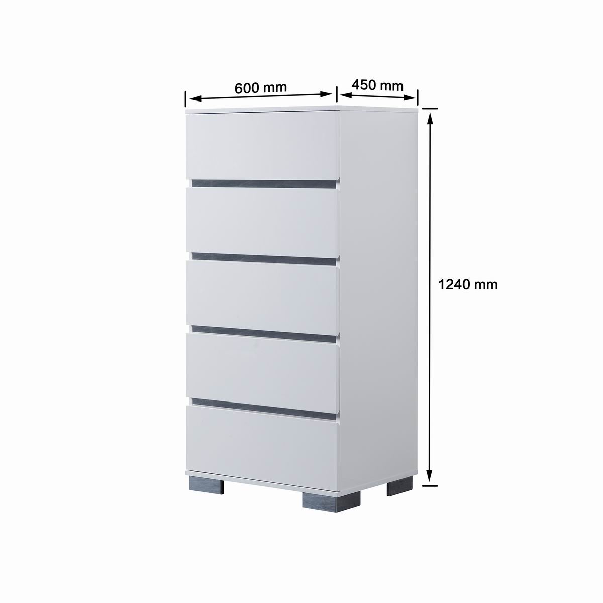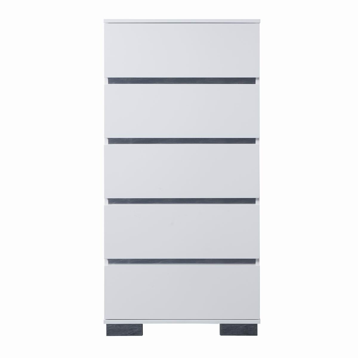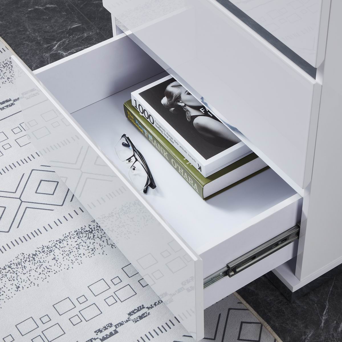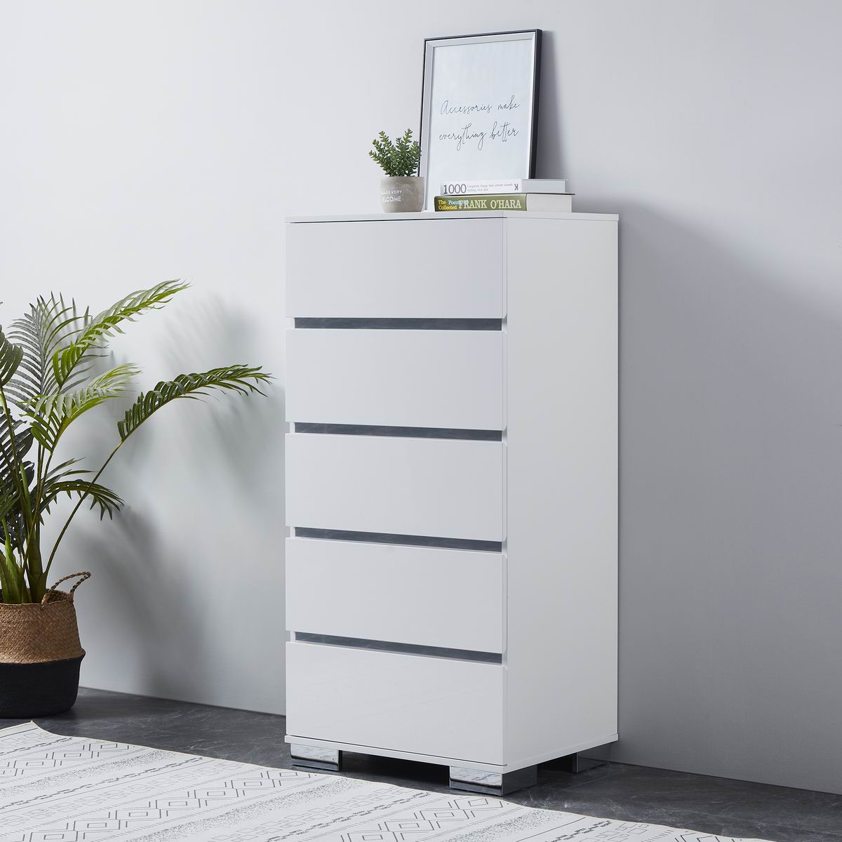 With the versatile white high gloss finish contrasting silver decorative line and silver color metal leg, this tallboy not only adds fashion elements to your bedroom, but also provides plenty of storage space. It's honeycomb packaging is eco friendly and recyclabe.