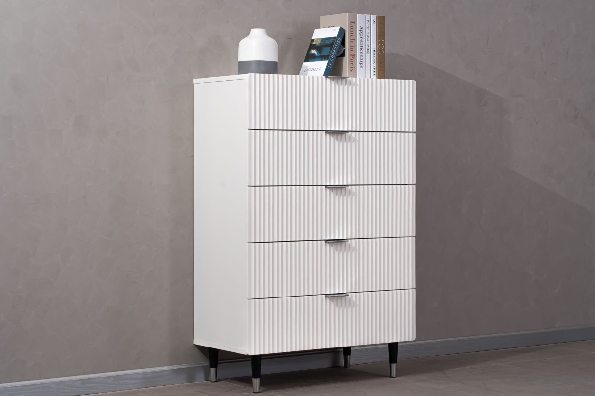It's featured with fluted drawer front and metal handles and legs, the Wave Tallboy will be a stand out in your bedroom, while optimising your storage space.