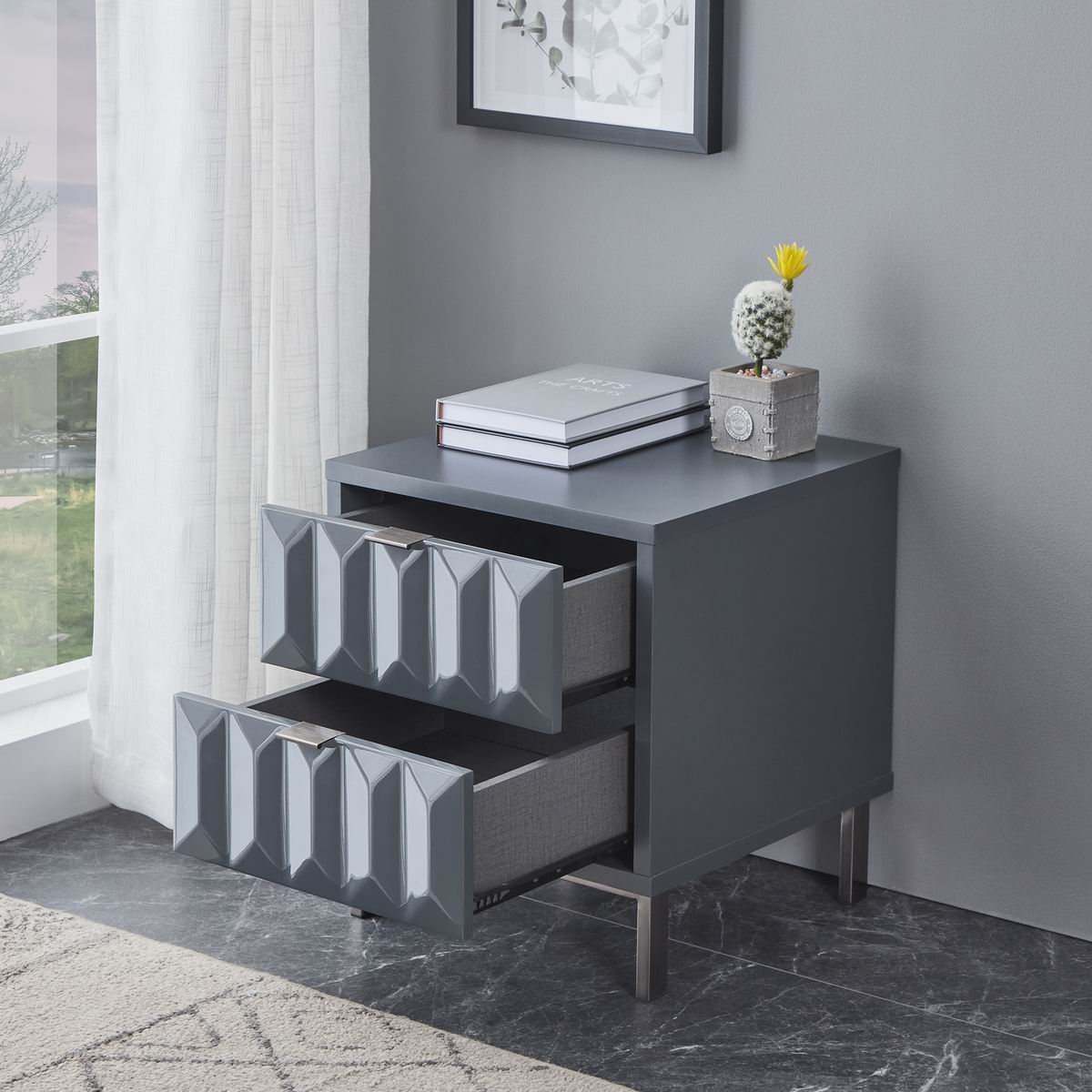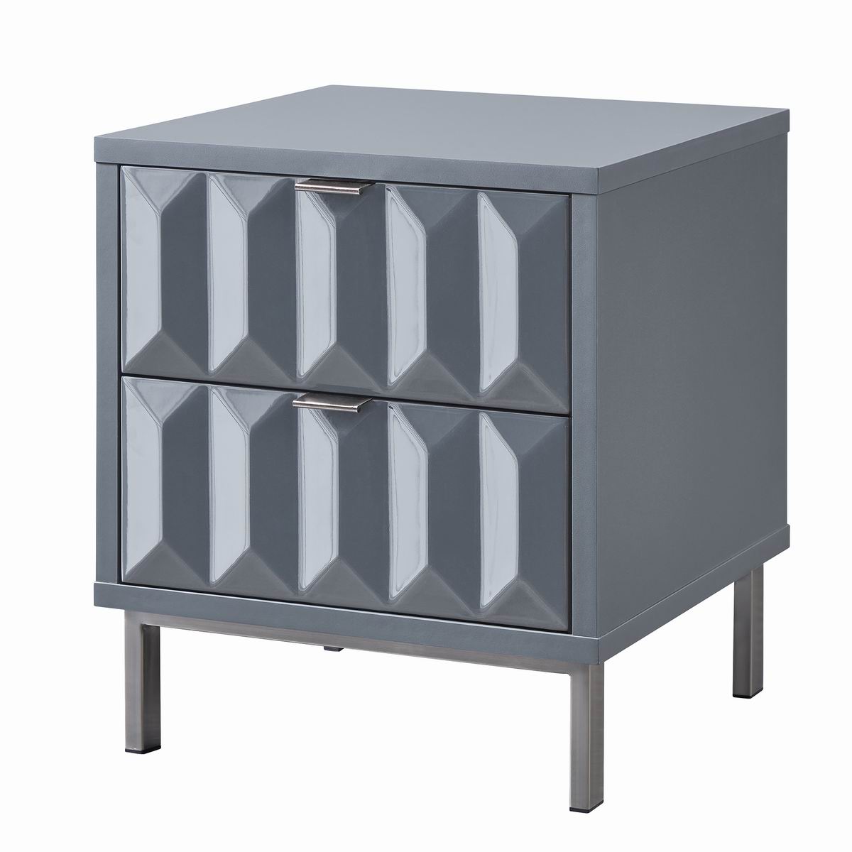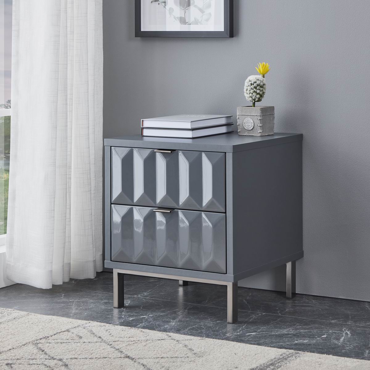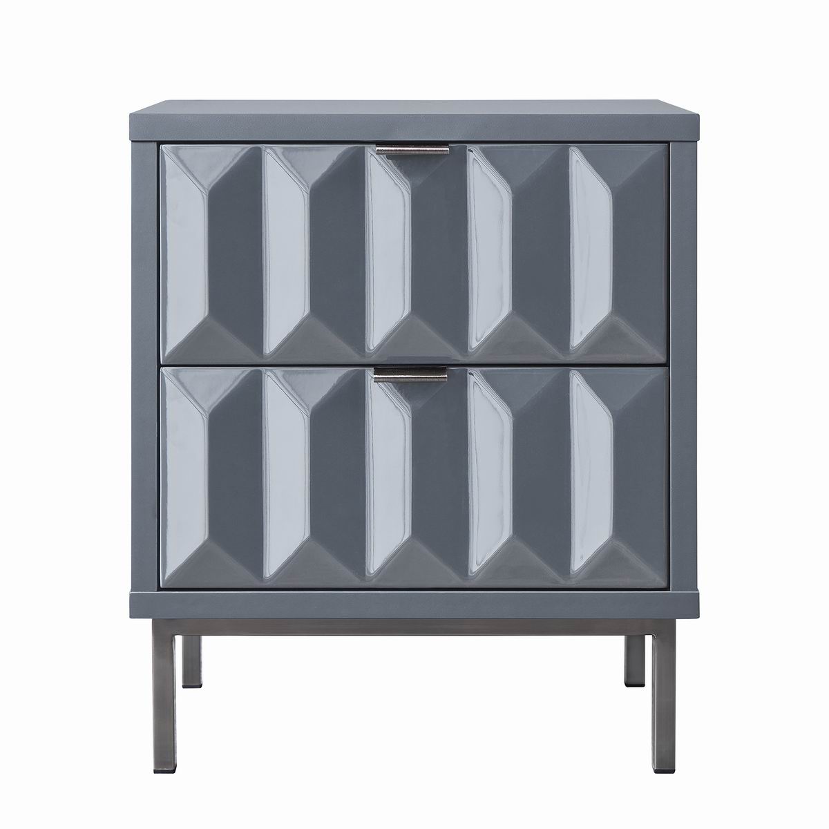 Lara bedside table with grey high gloss painted white drawer fronts, boasting a striking geometric design and a satin finish main body, brings a sleek contemporary style. It rests on high-shine smoke iron leg with brushed finish to complete the look and give added height.