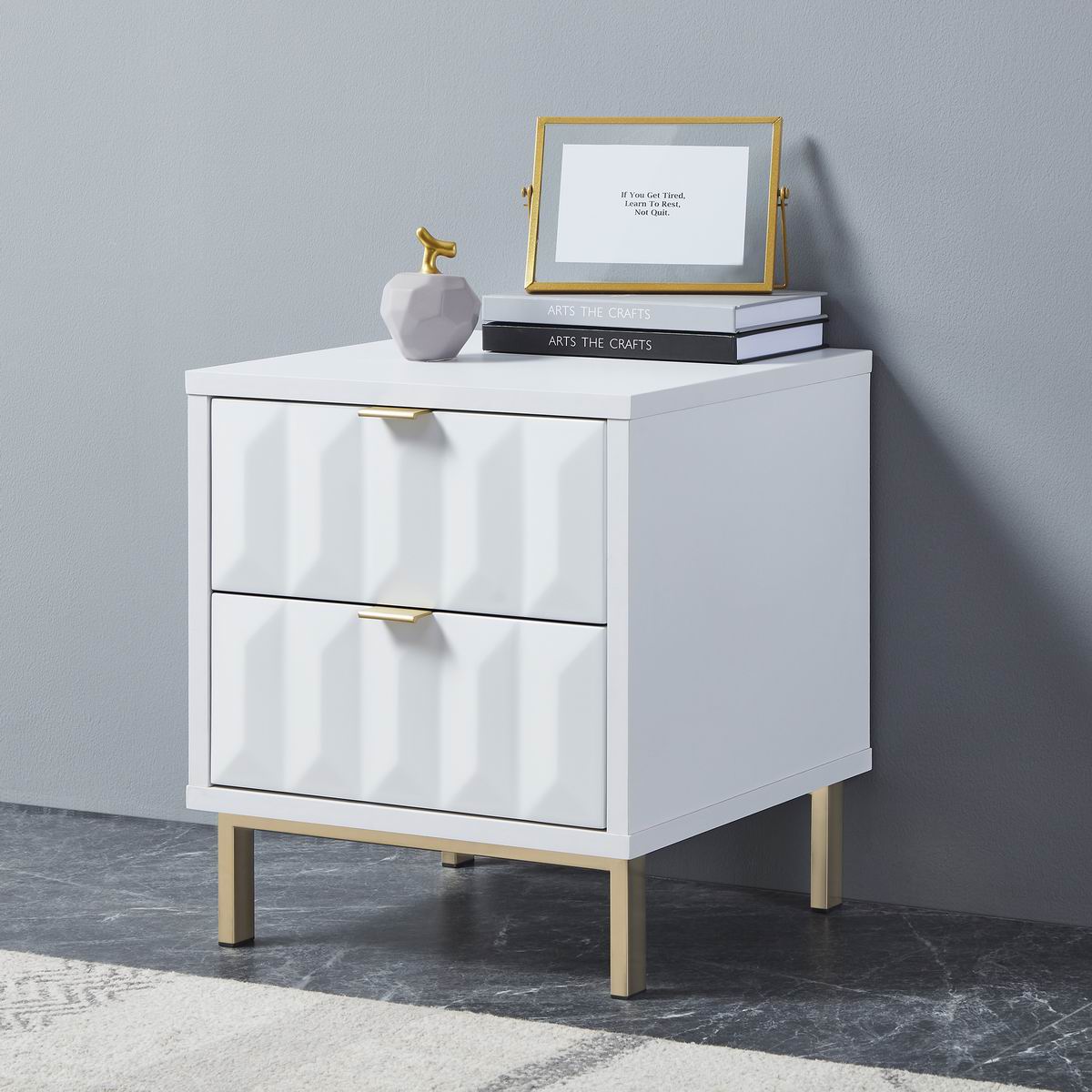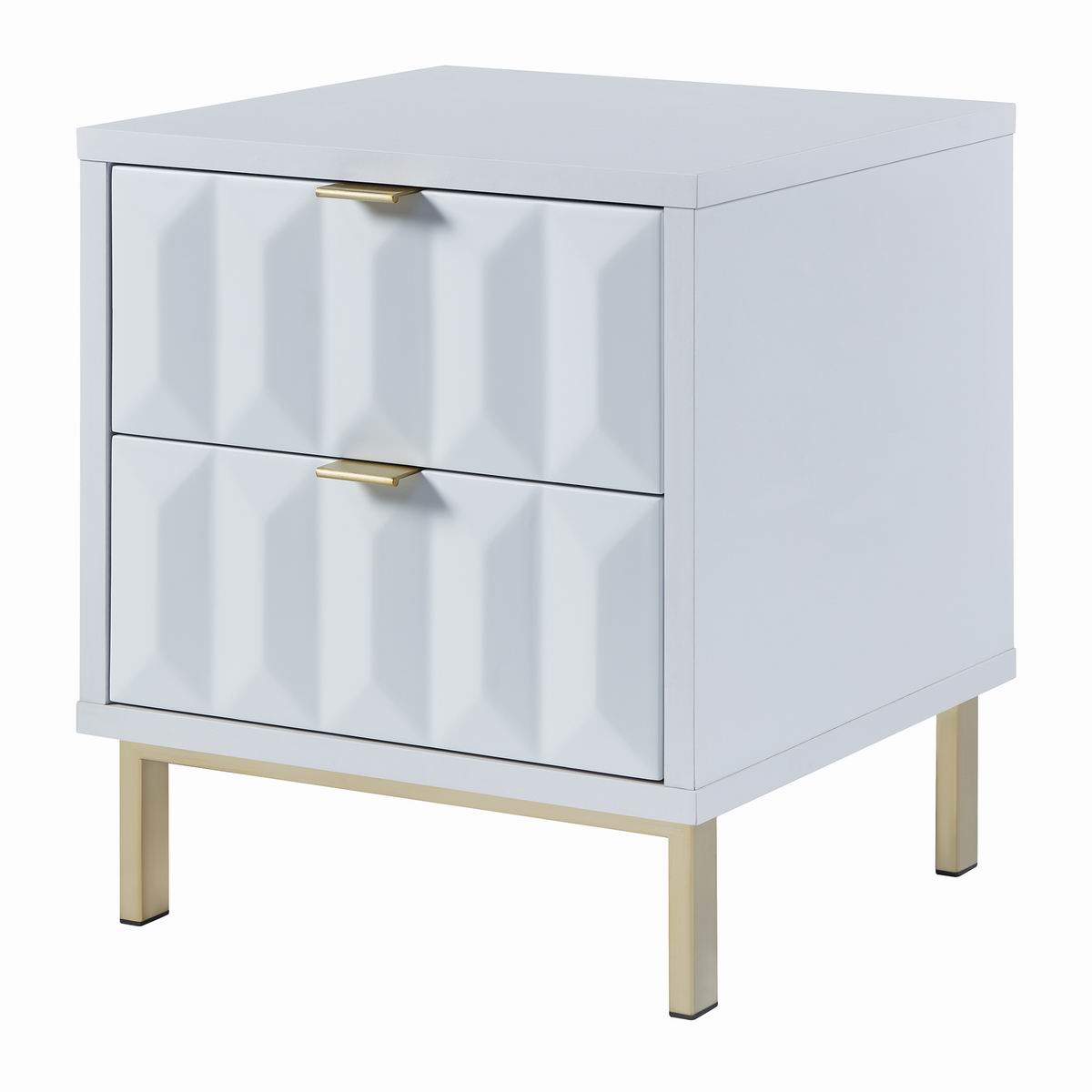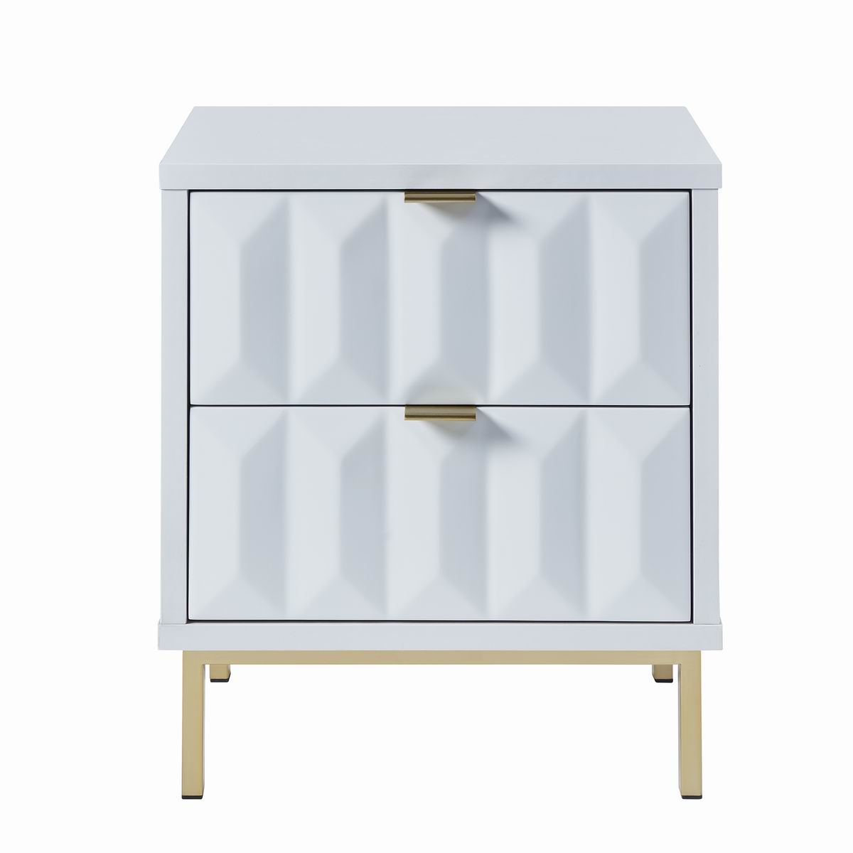 Lara bedside table with matt painted white drawer fronts, boasting a striking geometric design and a satin finish main body, brings a sleek contemporary style. It rests on golden iron leg with brushed finish to complete the look and give added height.