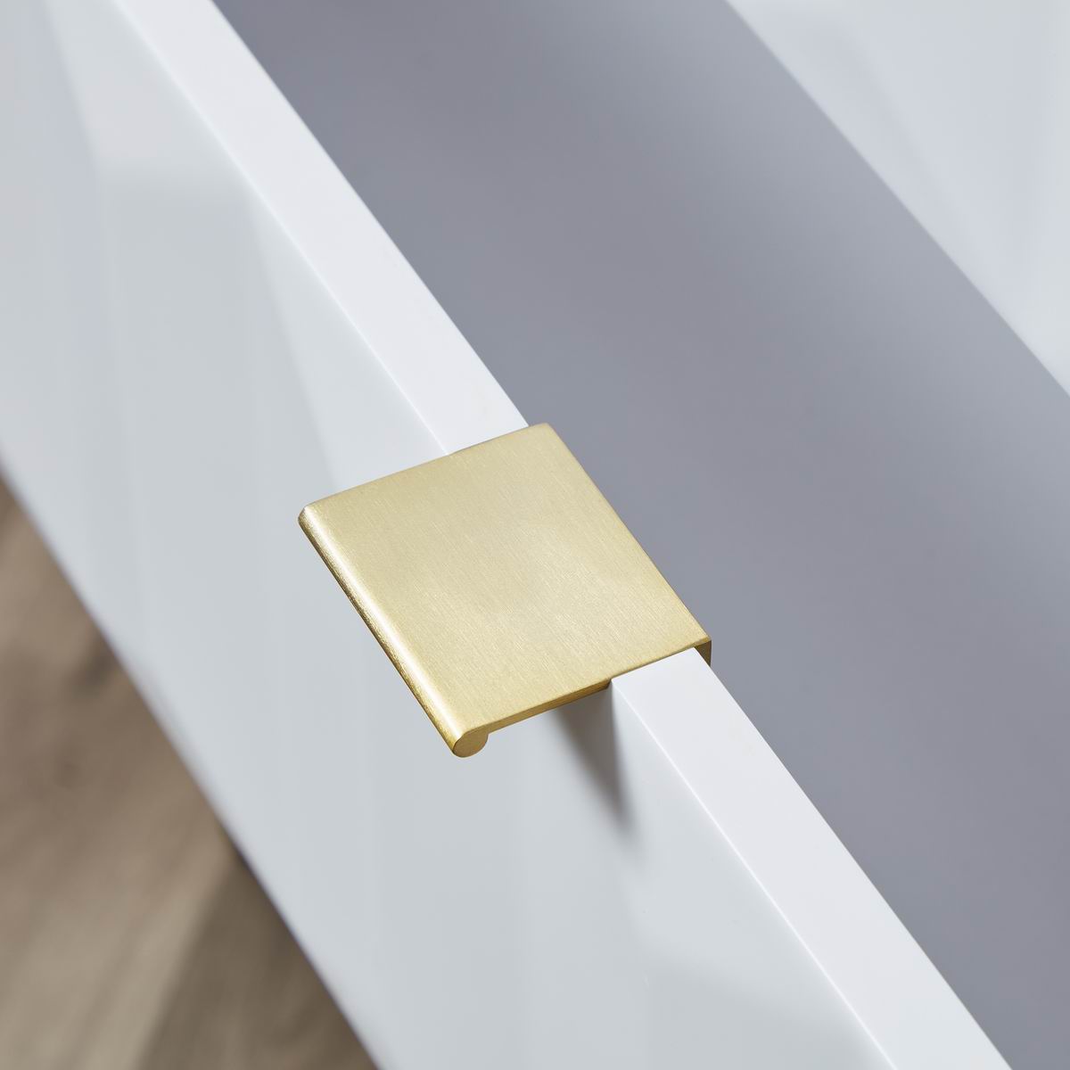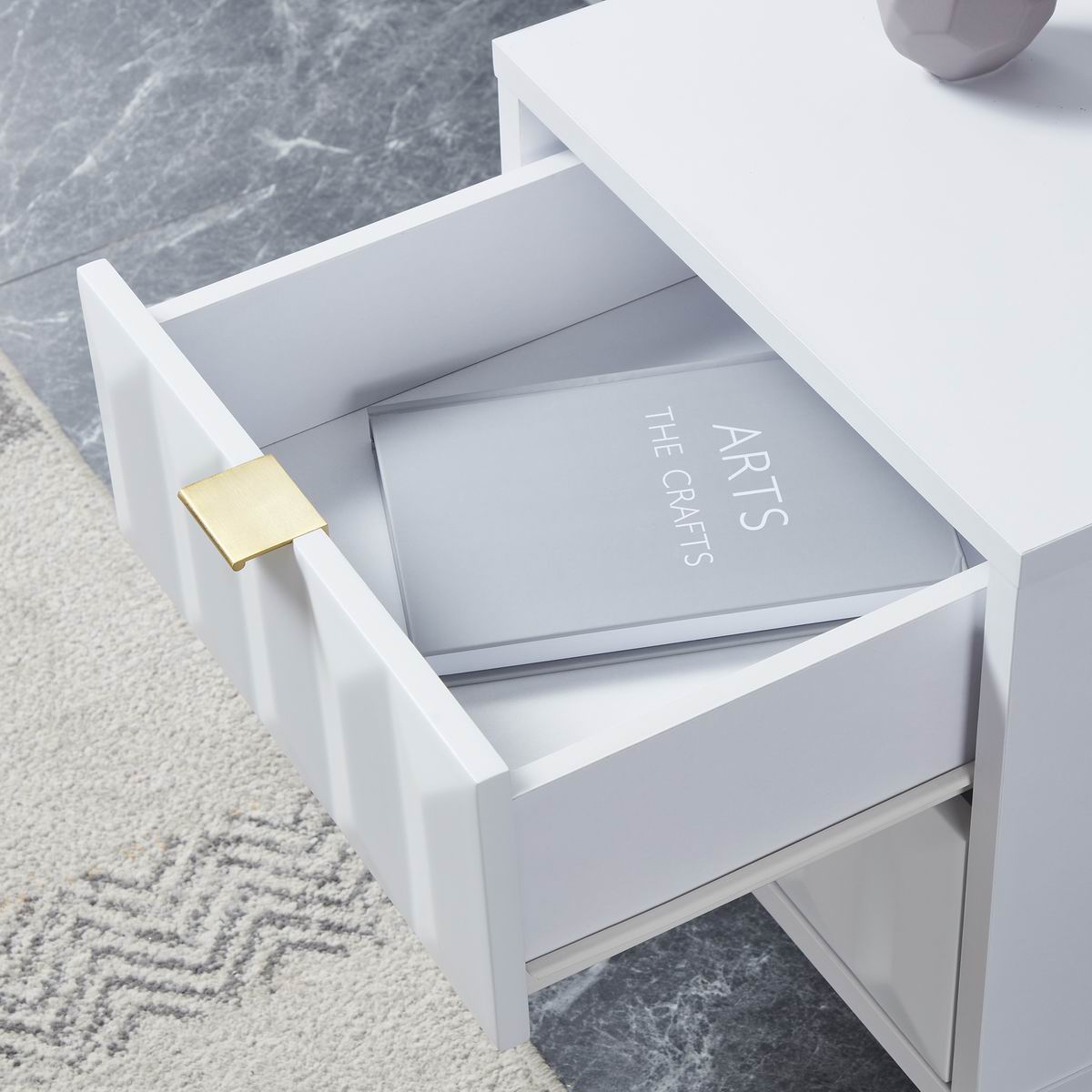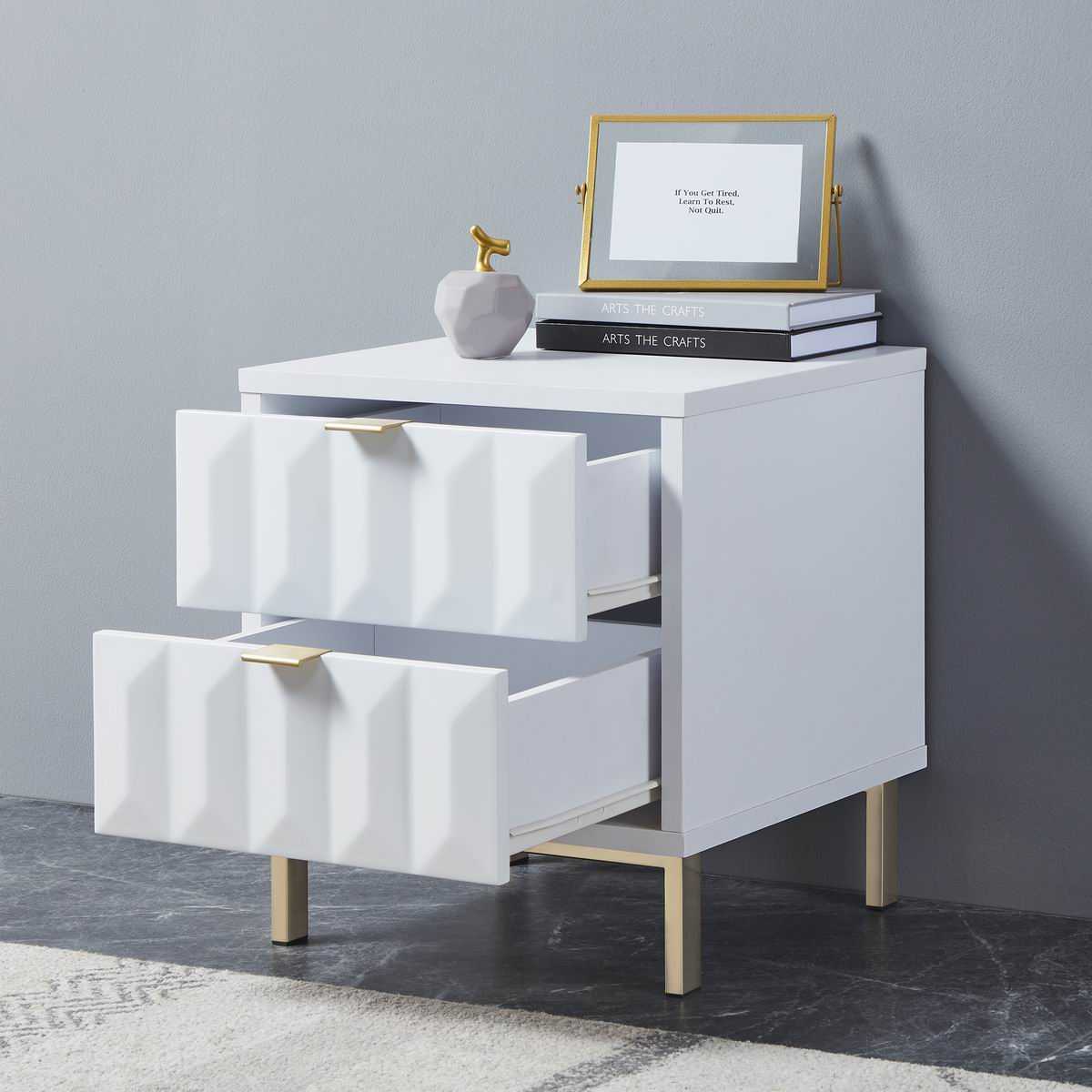 Lara bedside table with matt painted white drawer fronts, boasting a striking geometric design and a satin finish main body, brings a sleek contemporary style. It rests on golden iron leg with brushed finish to complete the look and give added height.