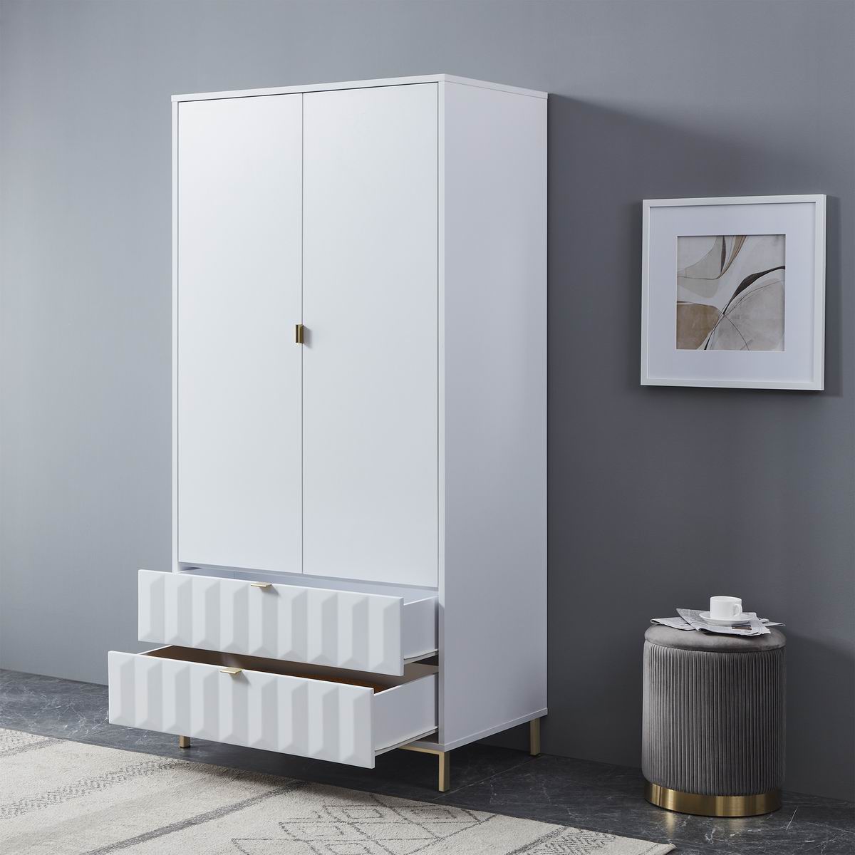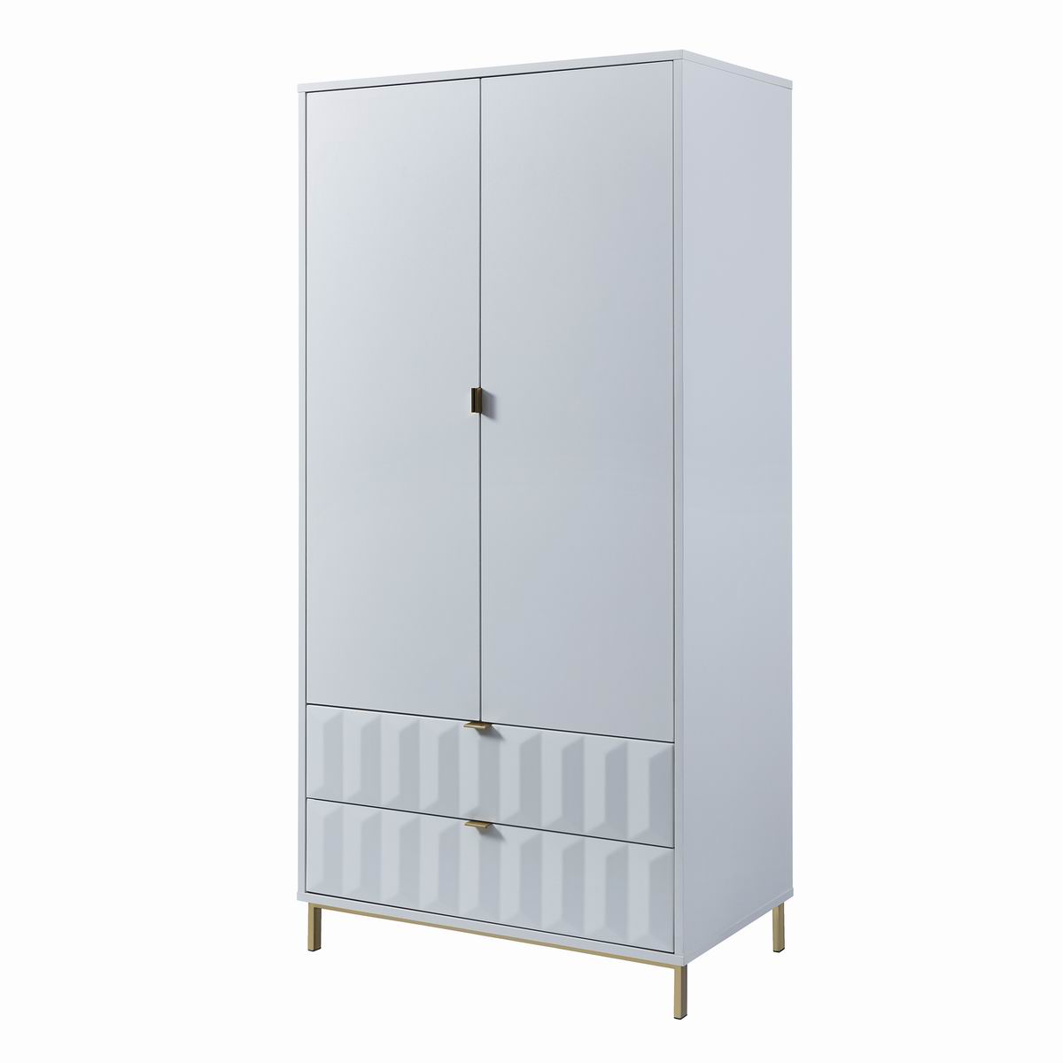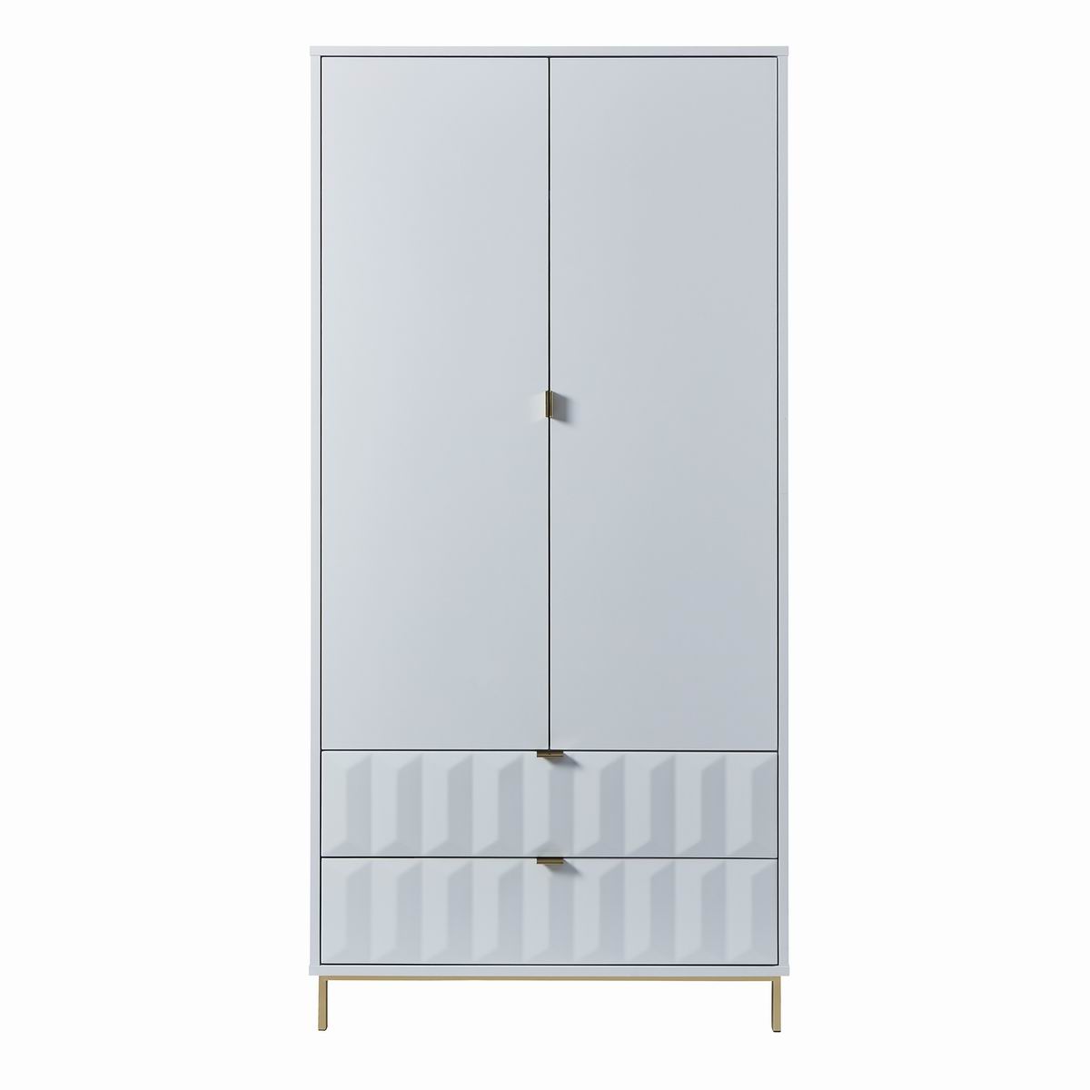 Lara double wardrobe with matt painted white drawer fronts, boasting a striking geometric design and a satin finish main body, brings a sleek contemporary style. It rests on golden iron leg with brushed finish to complete the look and give added height.
