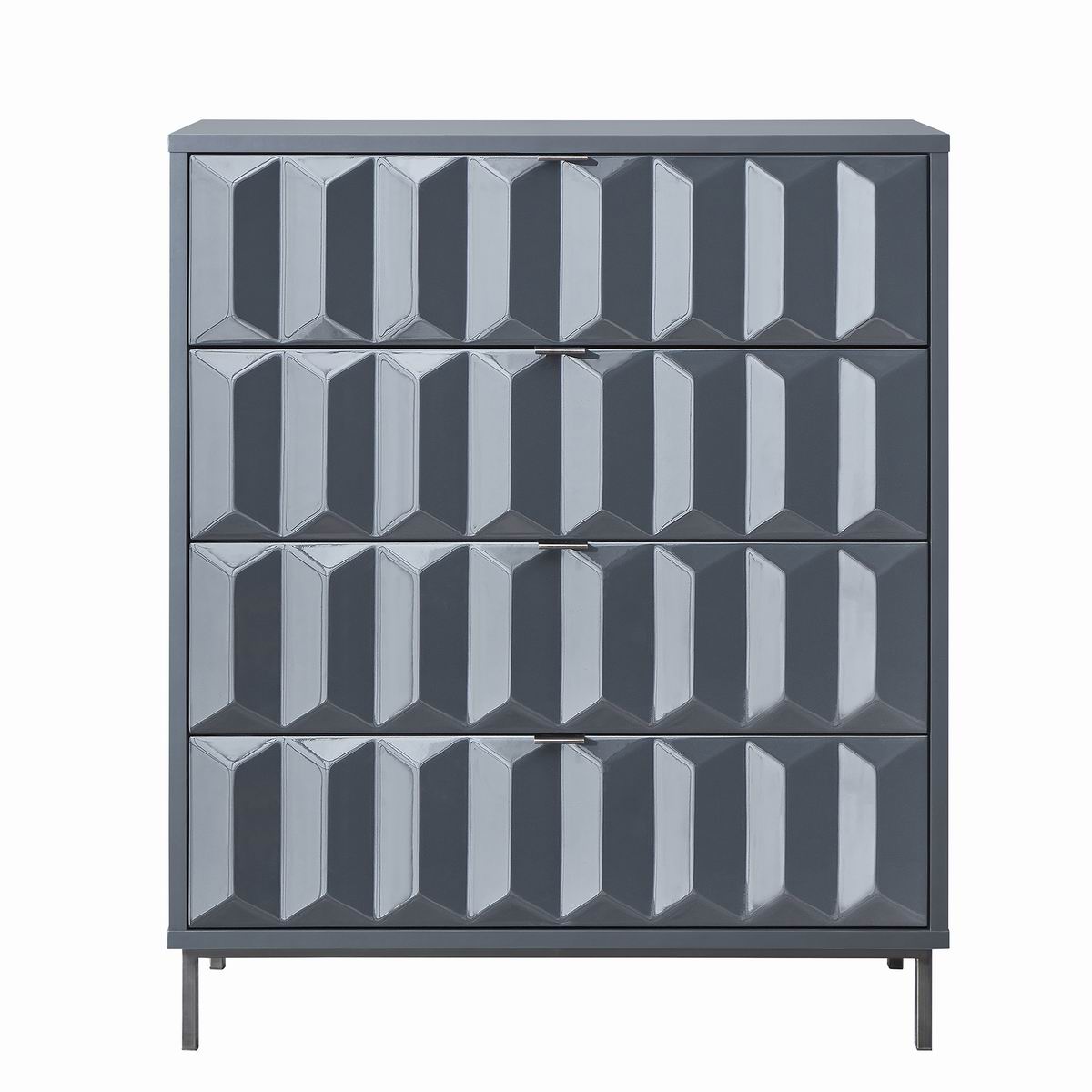 Lara 4-drawer with grey high gloss drawer fronts, boasting a striking geometric design and a satin finish main body, brings a sleek contemporary style. It rests on high-shine smoke iron leg with brushed finish to complete the look and give added height.