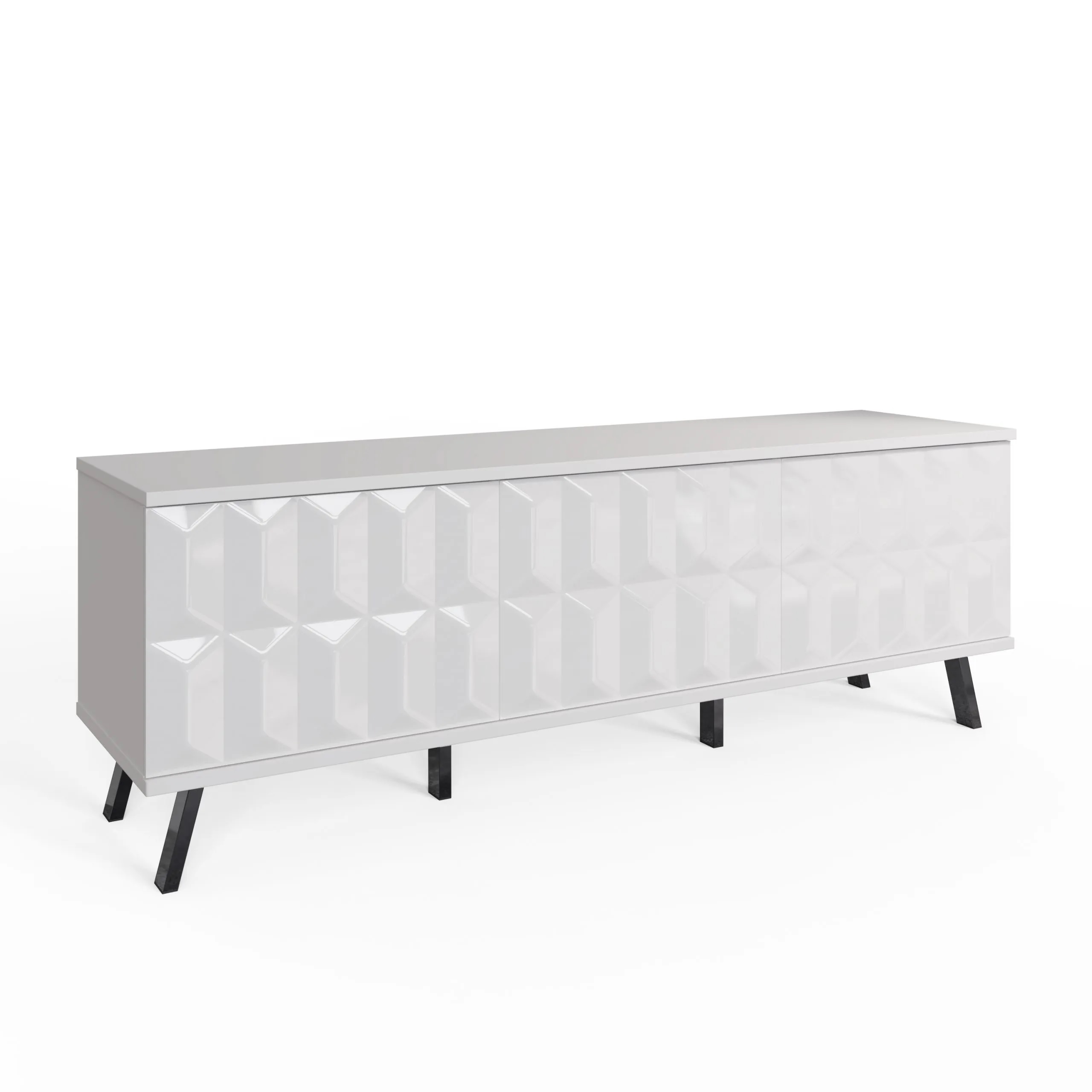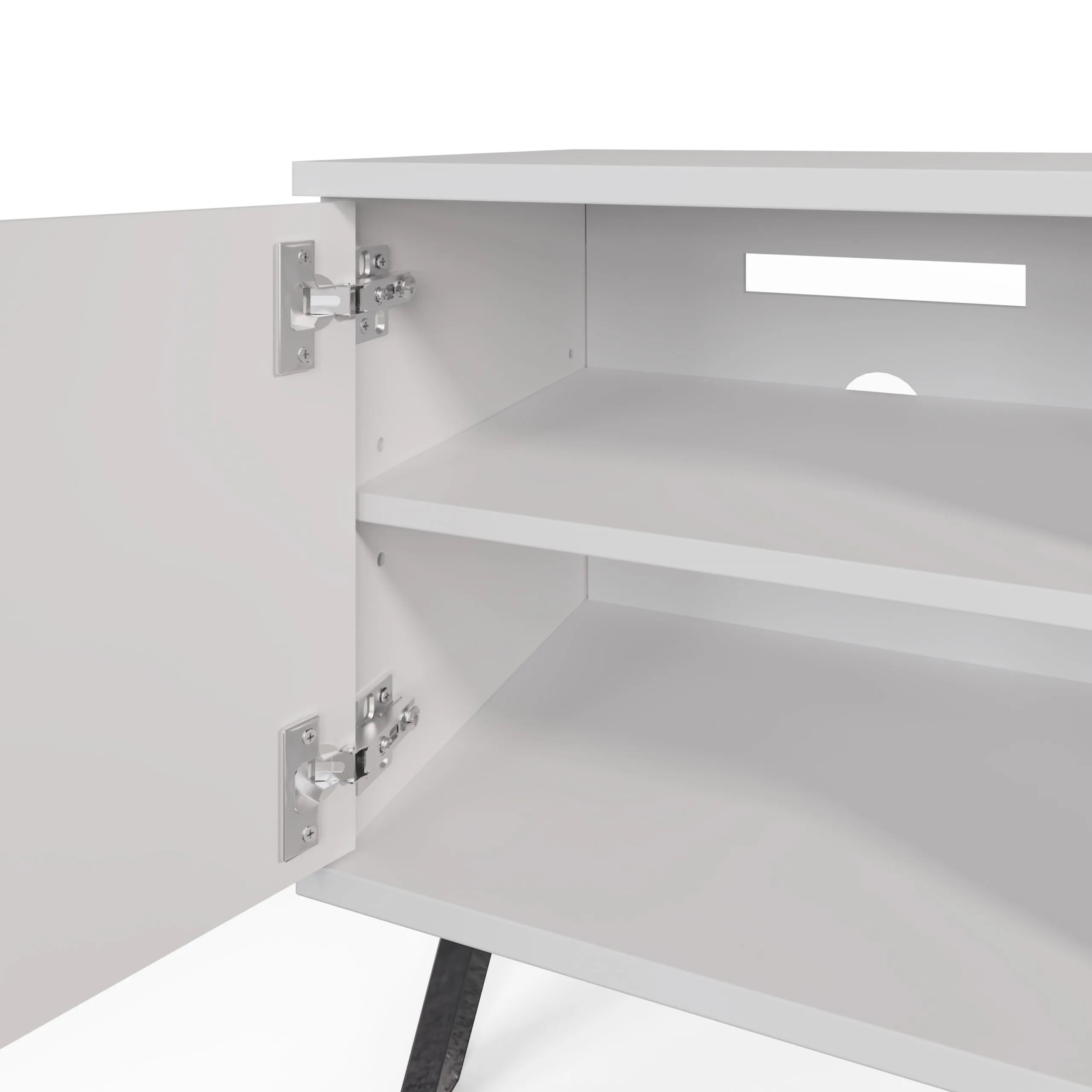 The Elevate TV unit with high gloss painted doors, boasting a striking geometric design and a satin finish main body, brings a sleek contemporary style. The TV unit rests high-shine smoke chrome legs to complete the look and give added height.