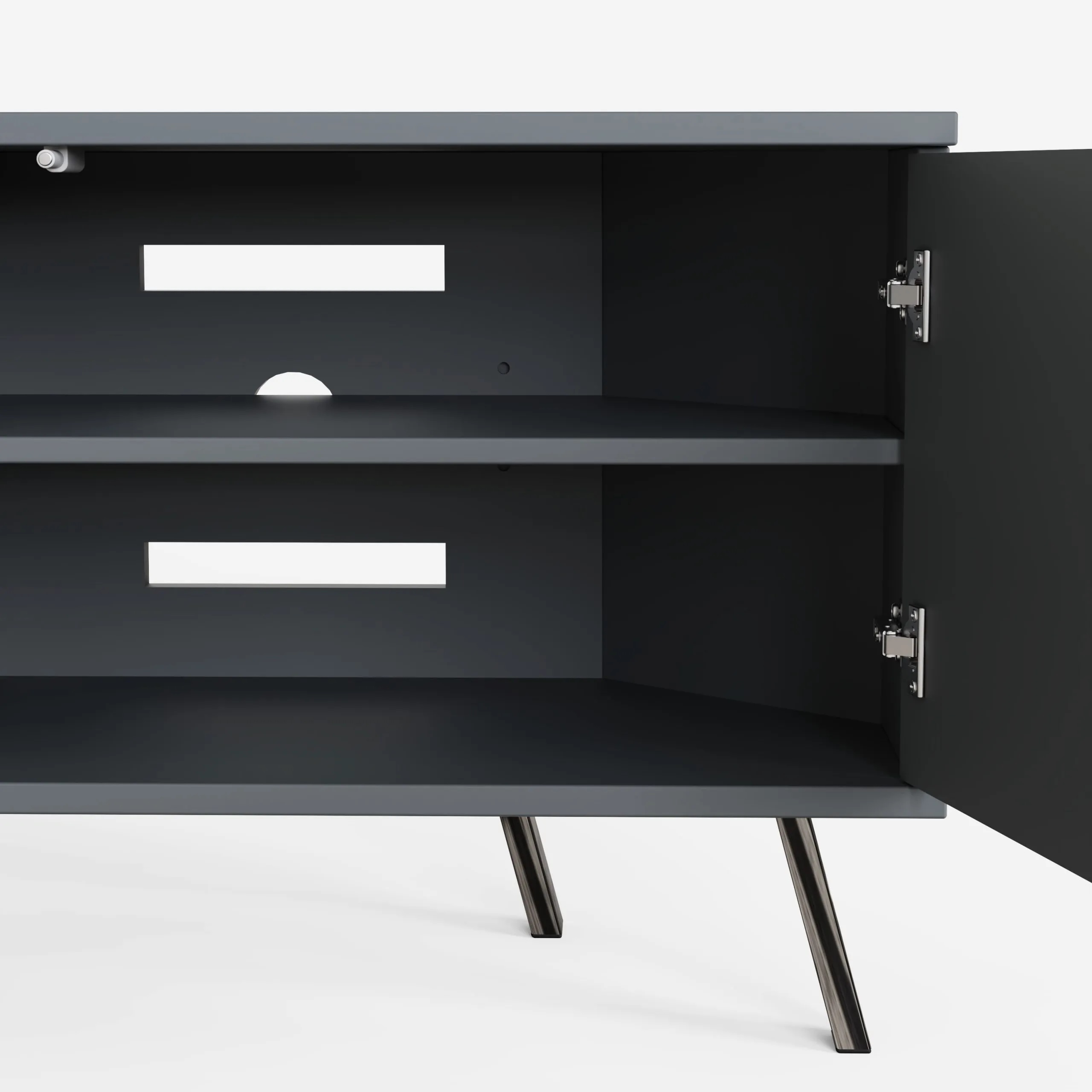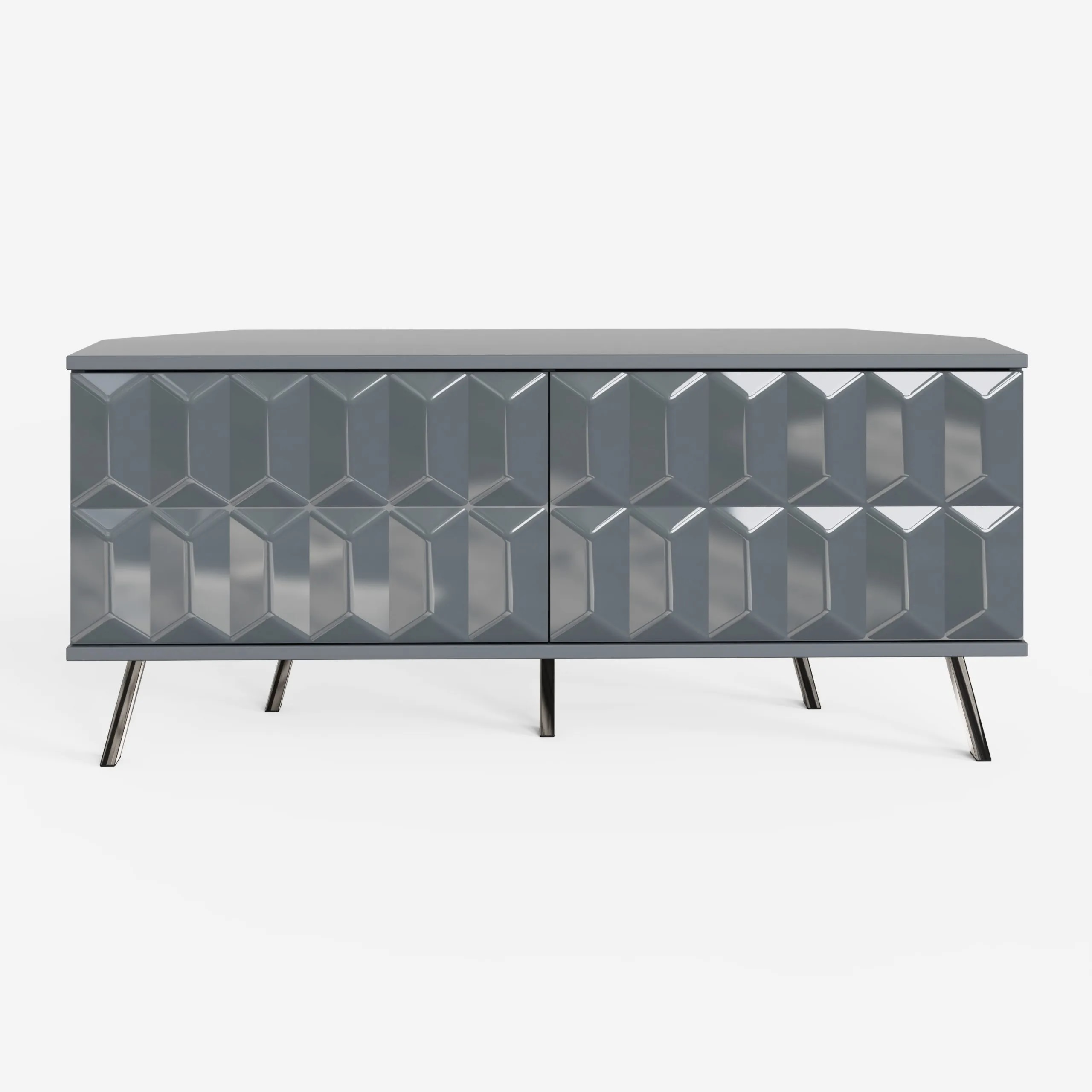 The Elevate corner TV unit with high-gloss painted doors, boasting a striking geometric design and a satin finish main body, brings a sleek contemporary style. The TV unit rests high-shine smoke chrome legs to complete the look and give added height.