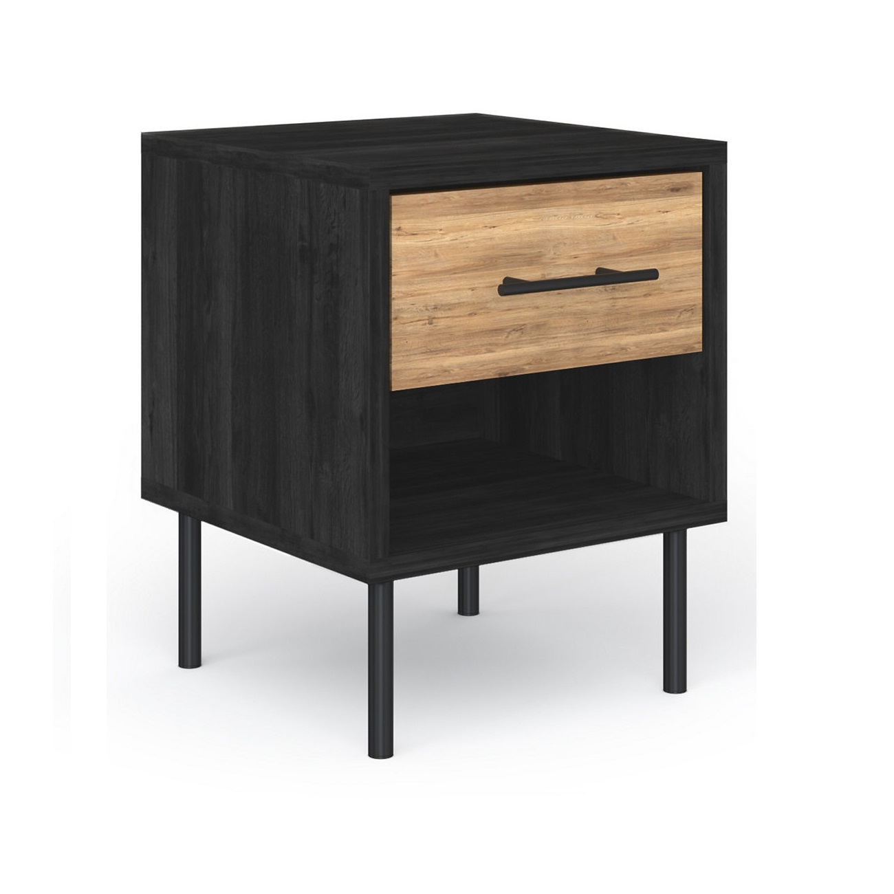 This small bedside table from the Holt collection is a contemporary take on a classic storage solution. The slim, wood-effect design sits on metal legs for a modern industrial look. It has one drawer with a shelf underneath, perfect for holding your book when you go to sleep.