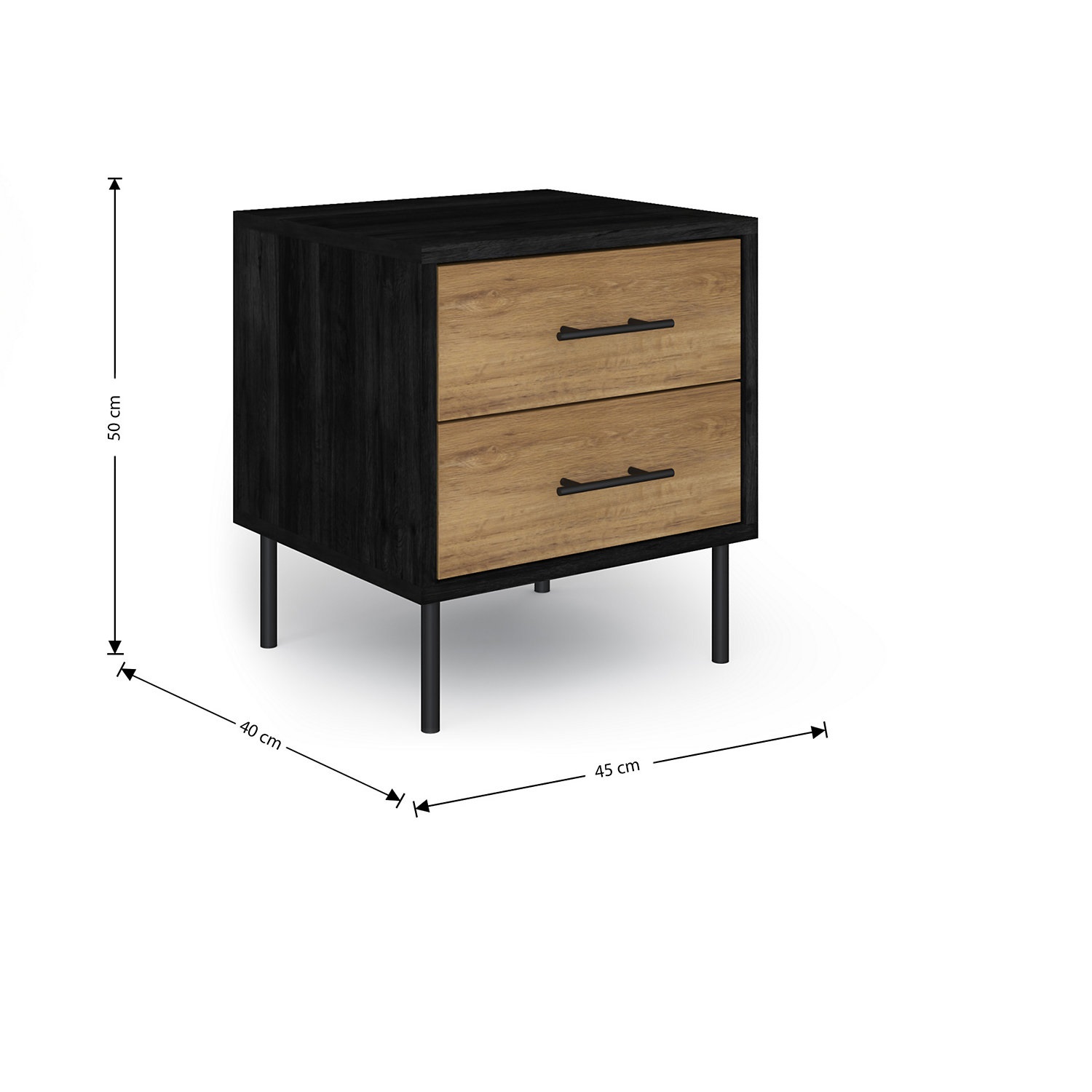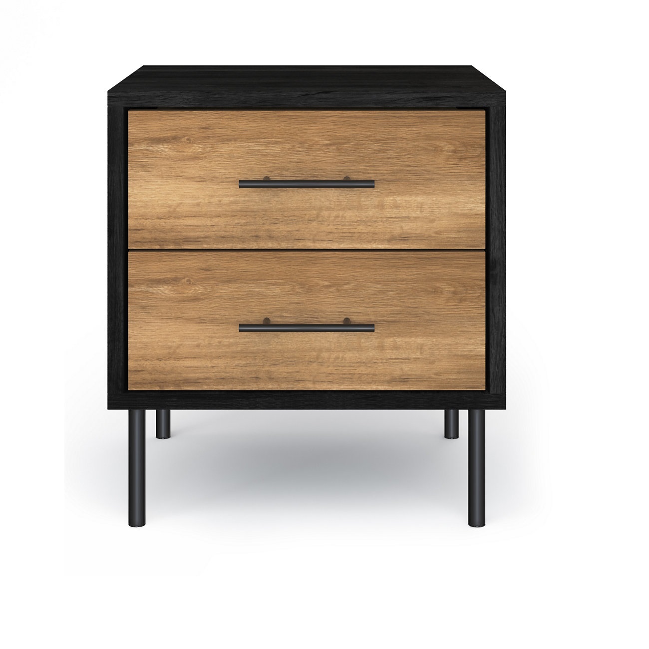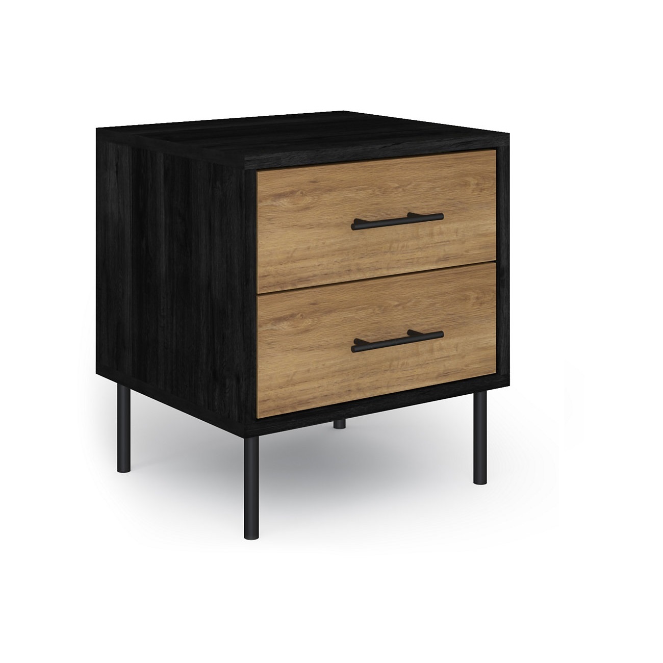 Rustic texture meets industrial style with the Holt bedside table. This stylish wood design stands on four metal legs to create a modern, airy aesthetic. The contrast effect on the two drawers adds to the contemporary feel.