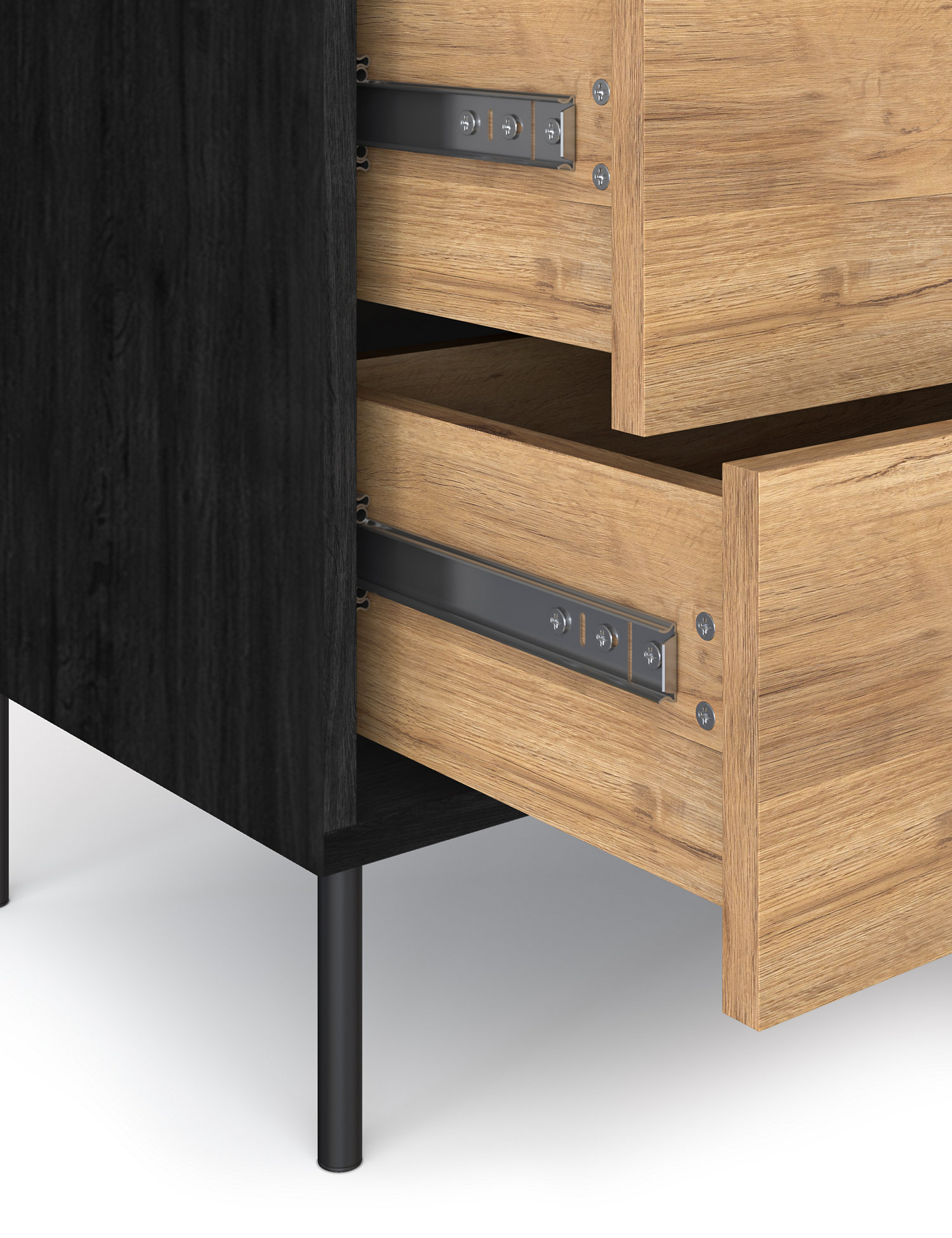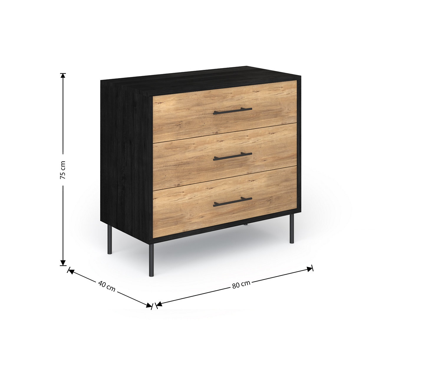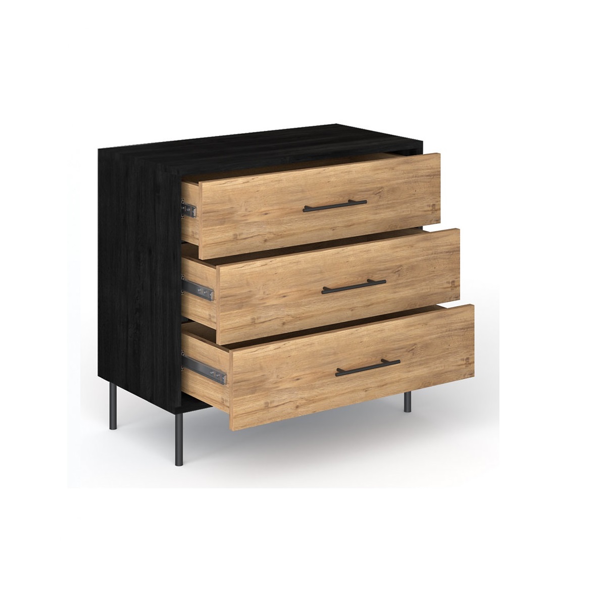This Holt chest of drawers fuses modern industrial style with rustic charm. The three-drawer design sits on four metal legs to help create a sense of space in your room. Its drawers are rendered in wood for natural texture and framed in a contrast tone for a contemporary feel.