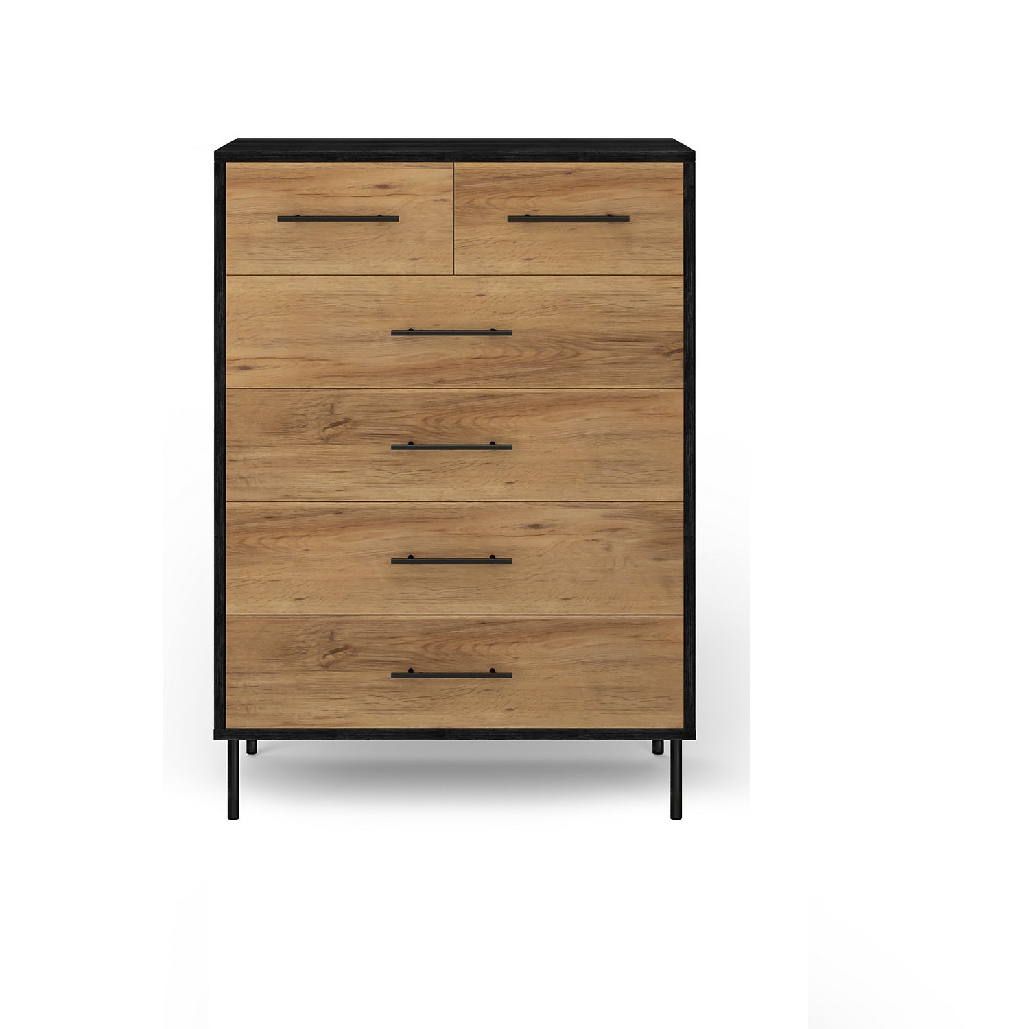 This Holt chest of drawers makes for a stylishly modern storage solution. Metal trims and a bold black body give it an unmistakable industrial character, which is softened by the natural wood effect. It features four full-length drawers and two half-length drawers at the top to help keep your things organised.