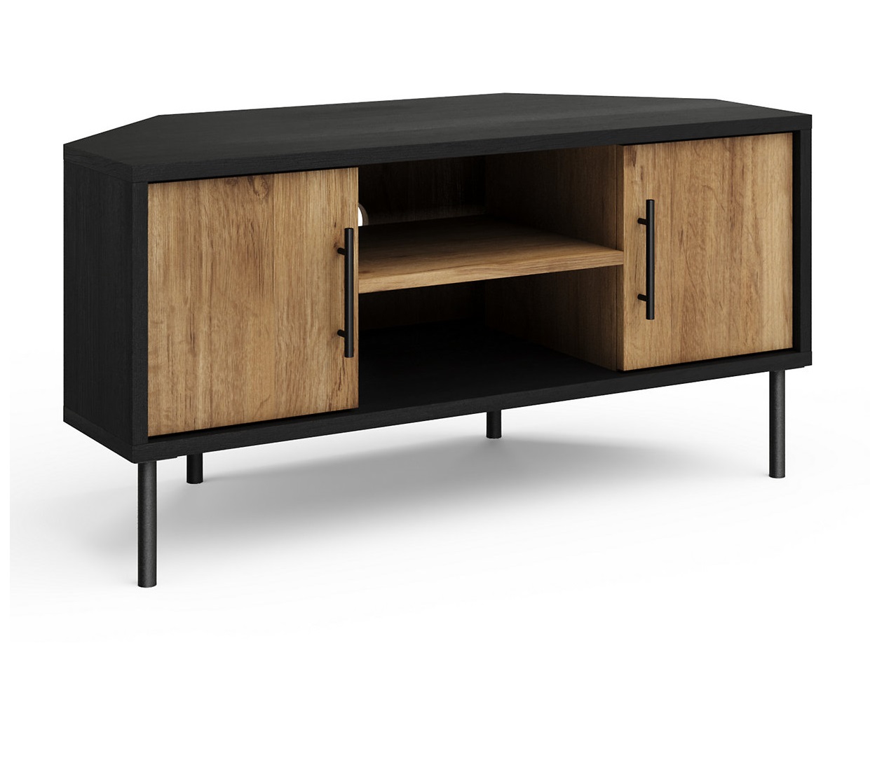 Add an industrial accent to your furnishings with this corner TV unit from our Holt collection. Its black oak finish contrasts with the rustic oak effect of the doors and middle shelf. This piece is easy to build, easy to clean and has plenty of storage for your sound system and more. Black metal bar handles and coordinating metal legs complete the look. Made with responsibly sourced wood.