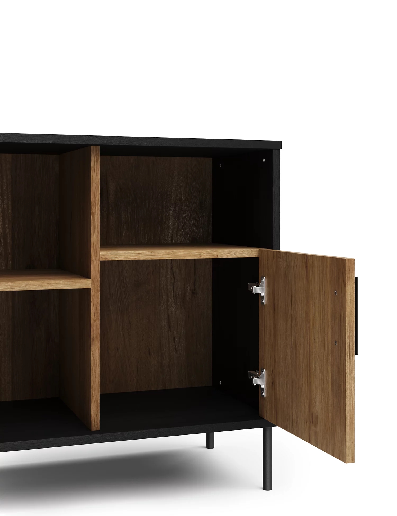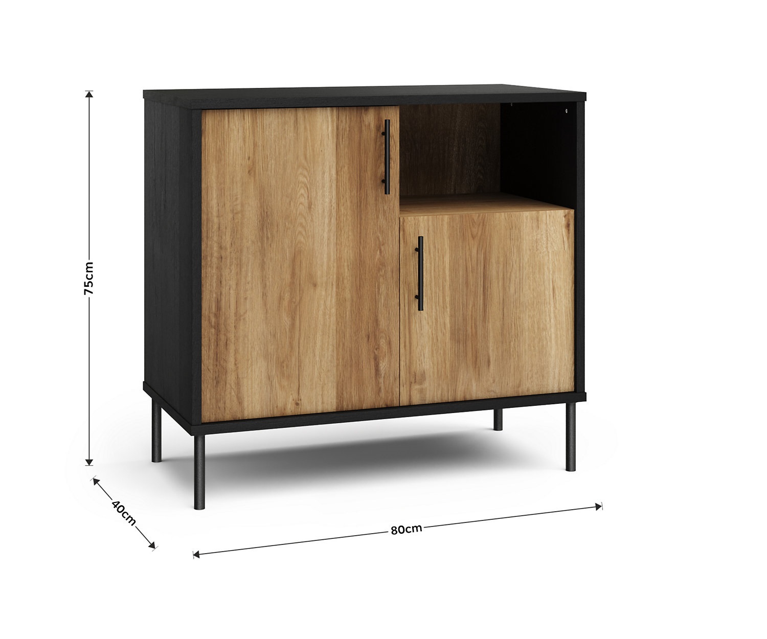 With a black oak-effect finish, this Holt sideboard combines contemporary industrial style with rustic charm. The four-compartment design is ideal for organising records, books and miscellaneous items. This piece features two doors at varying lengths, with black metal bar handles, and sits atop coordinating metal legs.