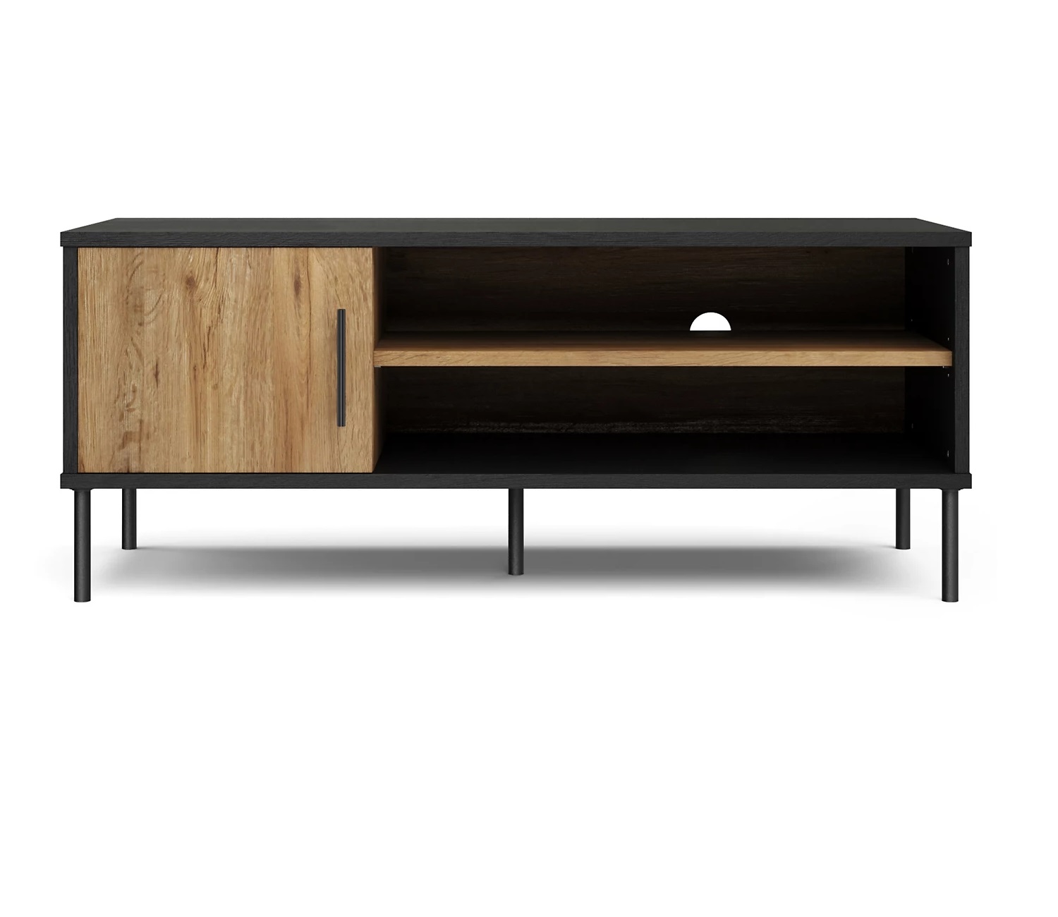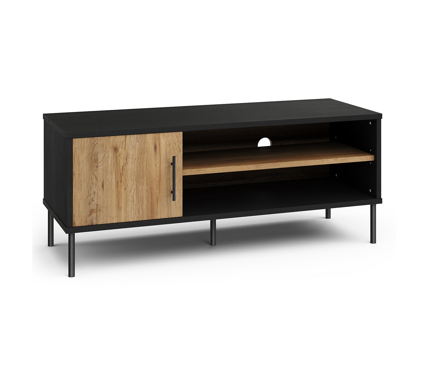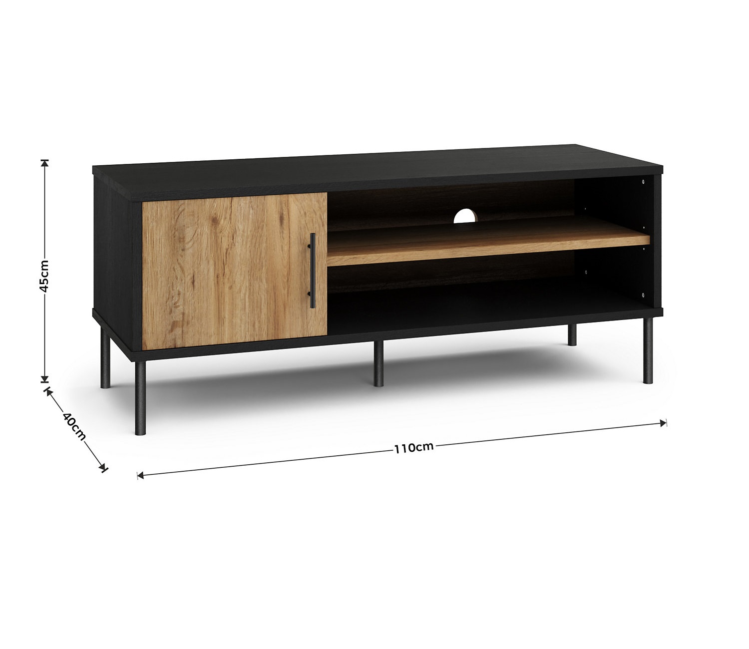 Your favourite shows will look even better with this TV unit from our Holt range, crafted from easy-to-clean chipboard. In a black oak effect, it fuses modern industrial styling with classic wood. This piece features a handy compartment with a door, finished with a black metal handle and coordinating metal legs. Store your tech on the divided shelf, which comes with a convenient cable hole. Made with responsibly sourced wood.