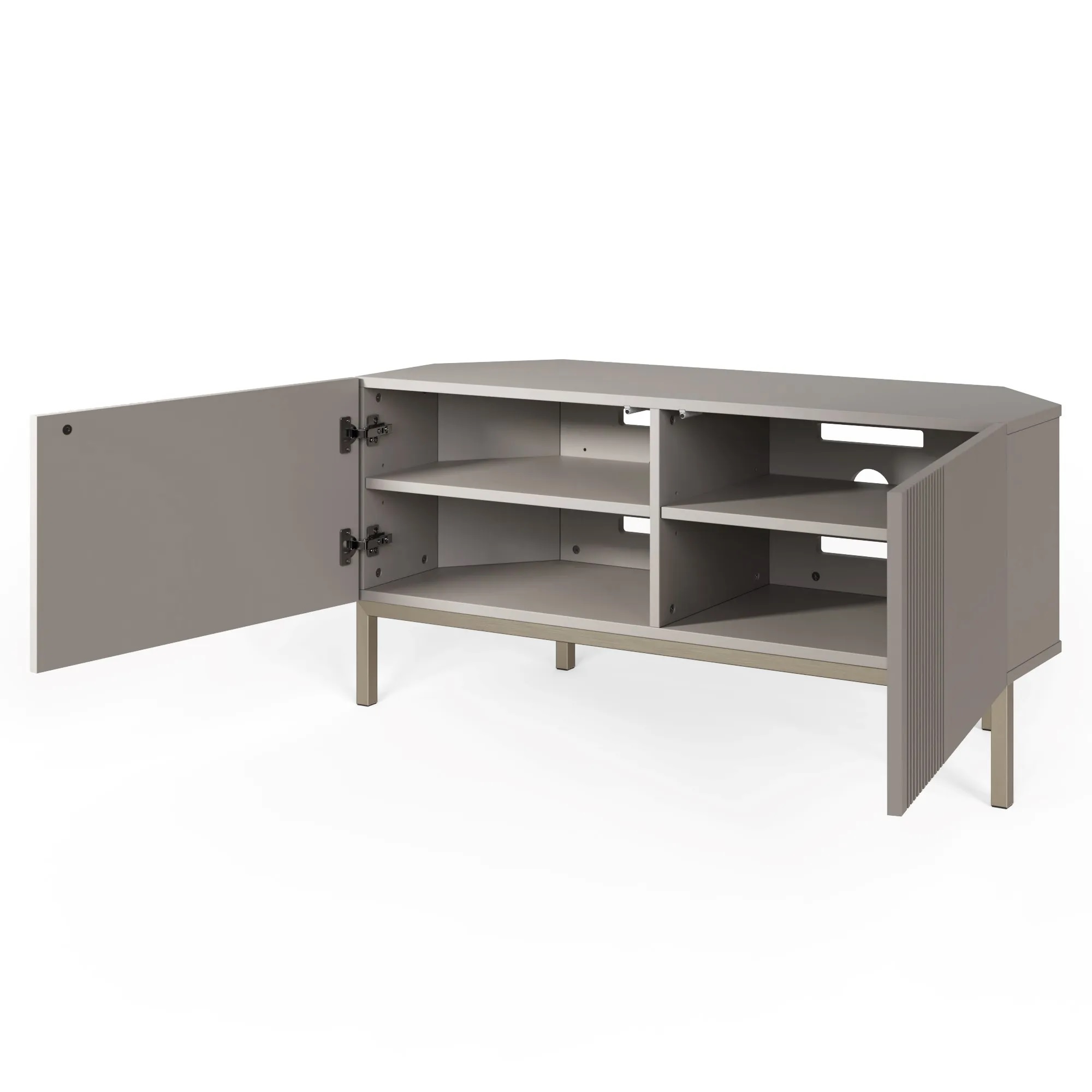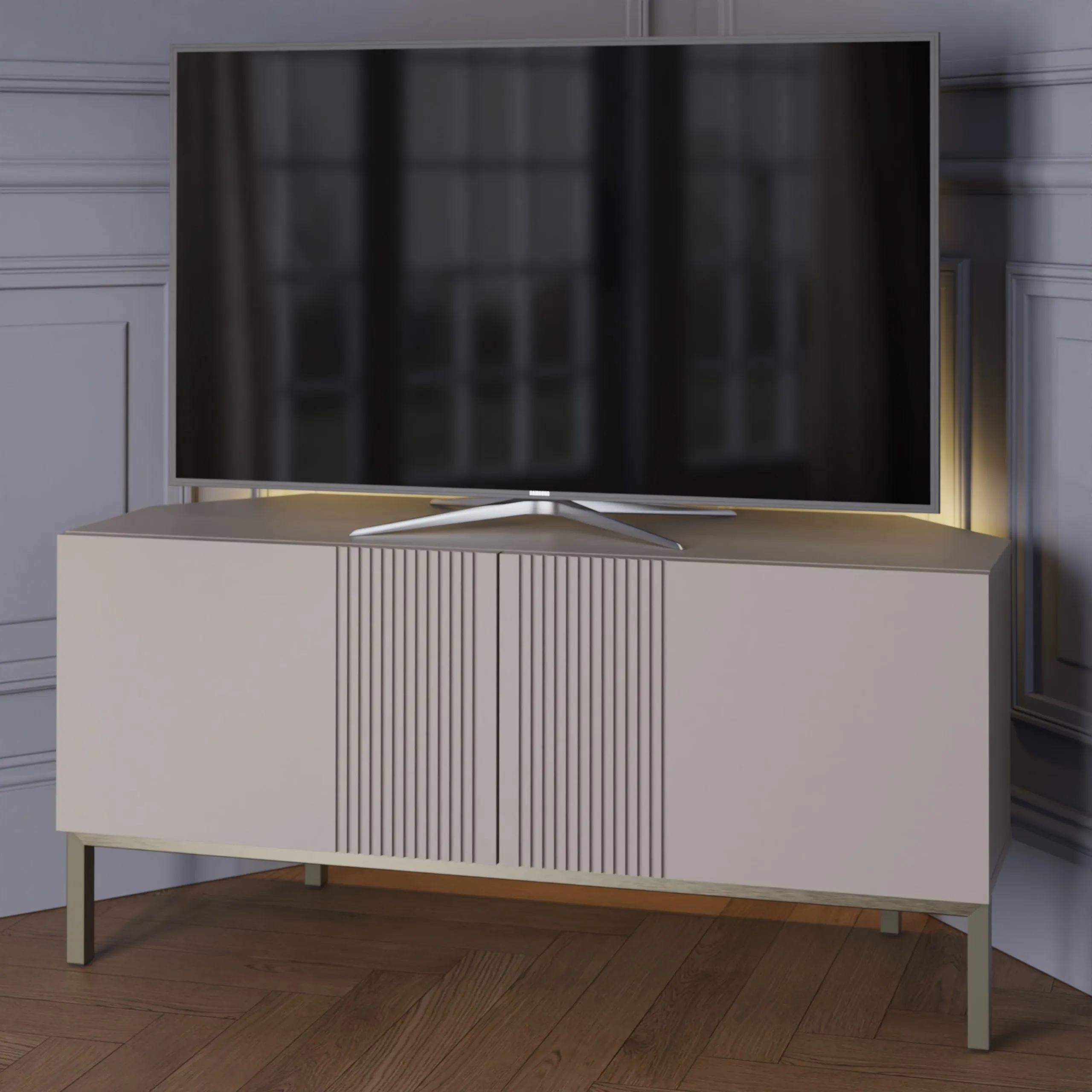 Beautiful two door corner TV unit with a subtle fluted design and striking brushed nickel legs. Easy and extremely quick to build, with patented click-together furniture system. Super-fast, super strong and no visible assembly fixings. Suitable for both the contemporary and classical home.