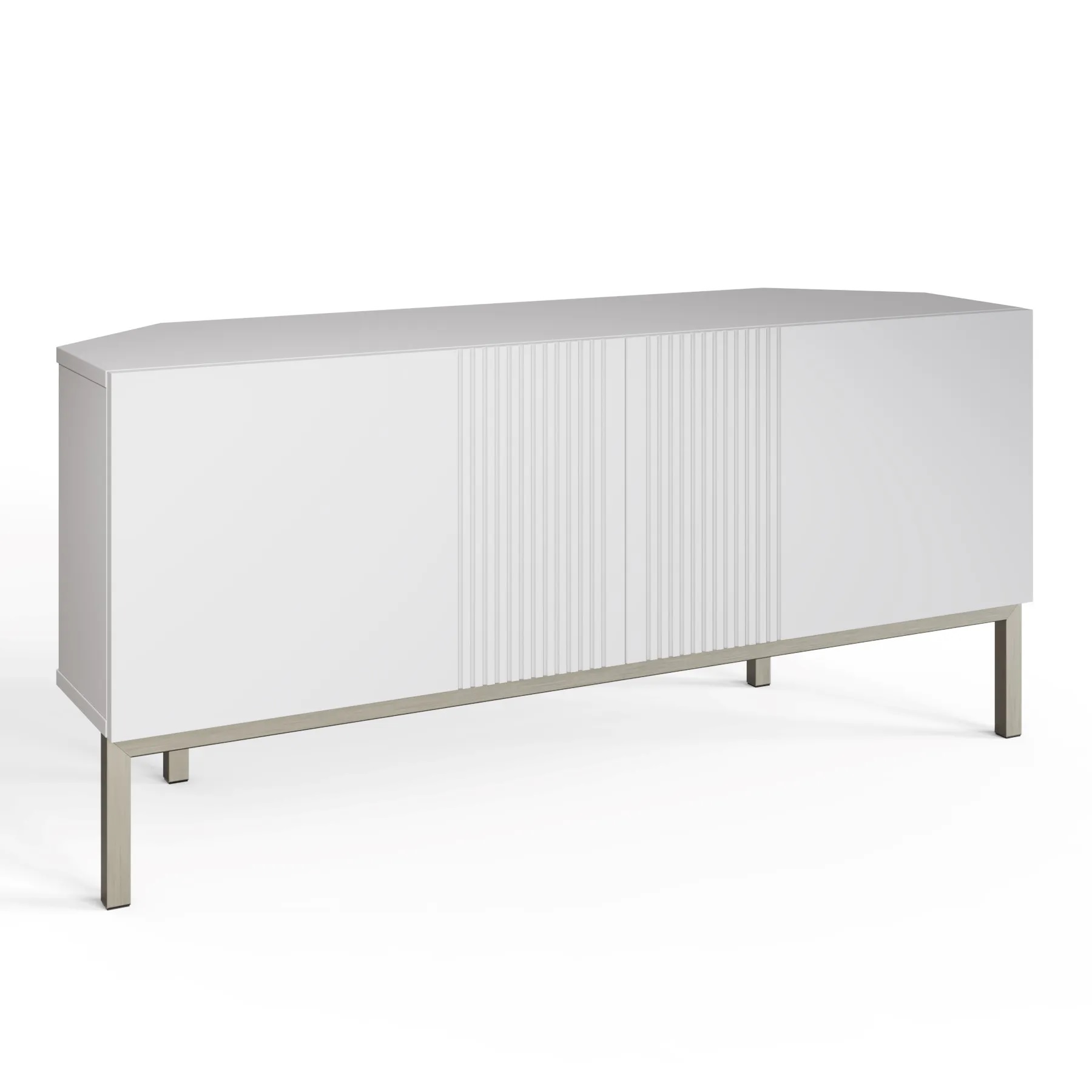Beautiful two door corner TV unit with a subtle fluted design and striking brushed nickel legs. Easy and extremely quick to build, with patented click-together furniture system. Super-fast, super strong and no visible assembly fixings. Suitable for both the contemporary and classical home.