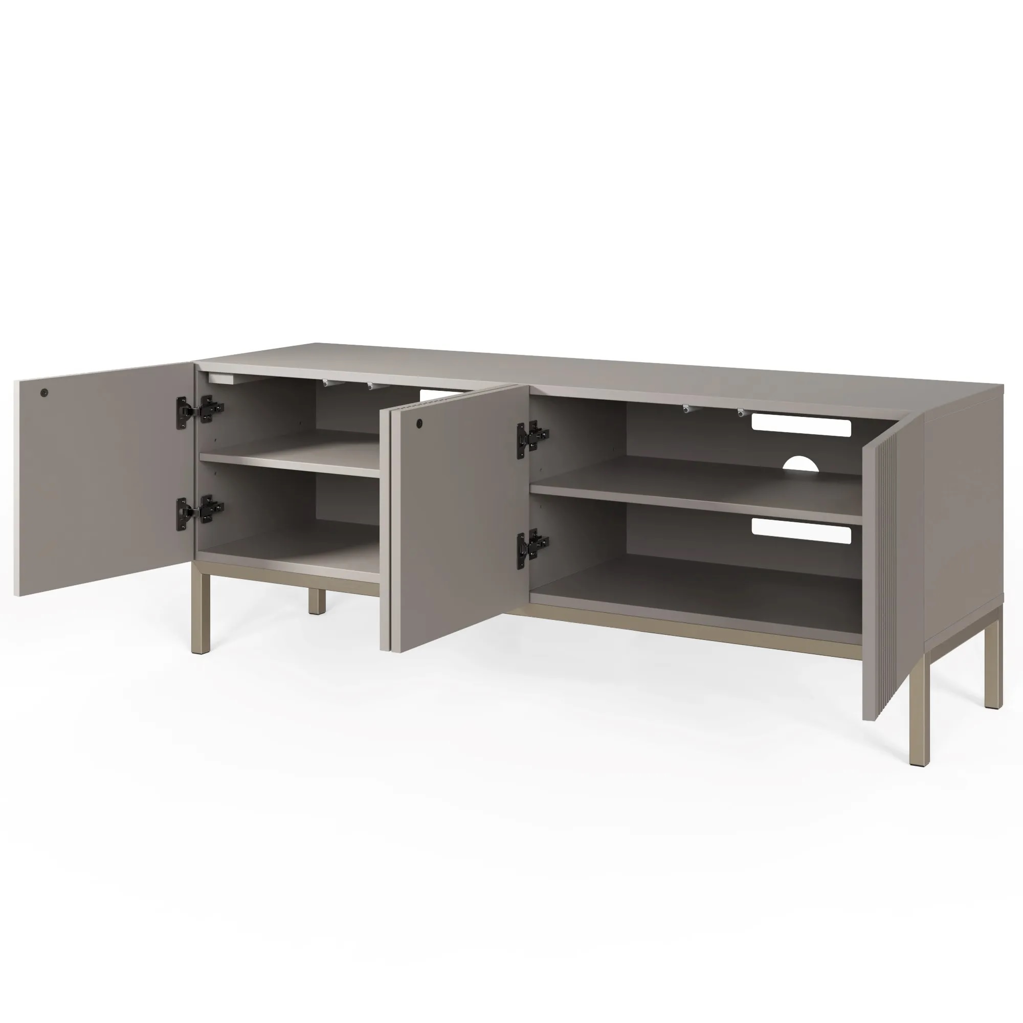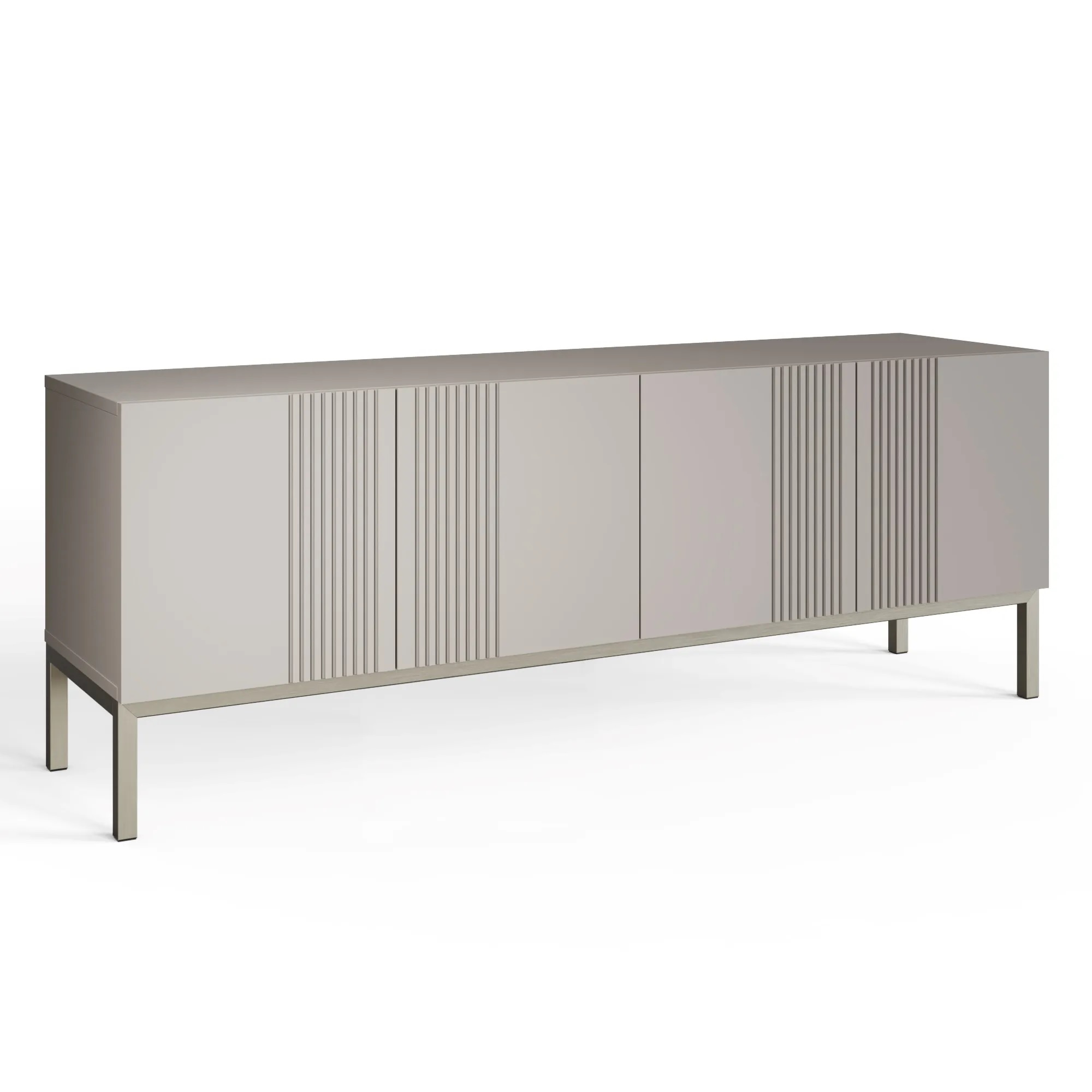 Beautiful 3 door TV unit with a subtle fluted design and striking brushed nickel legs. Easy and extremely quick to build, with patented click-together furniture system. Super-fast, super strong and no visible assembly fixings. Suitable for both the contemporary and classical home.