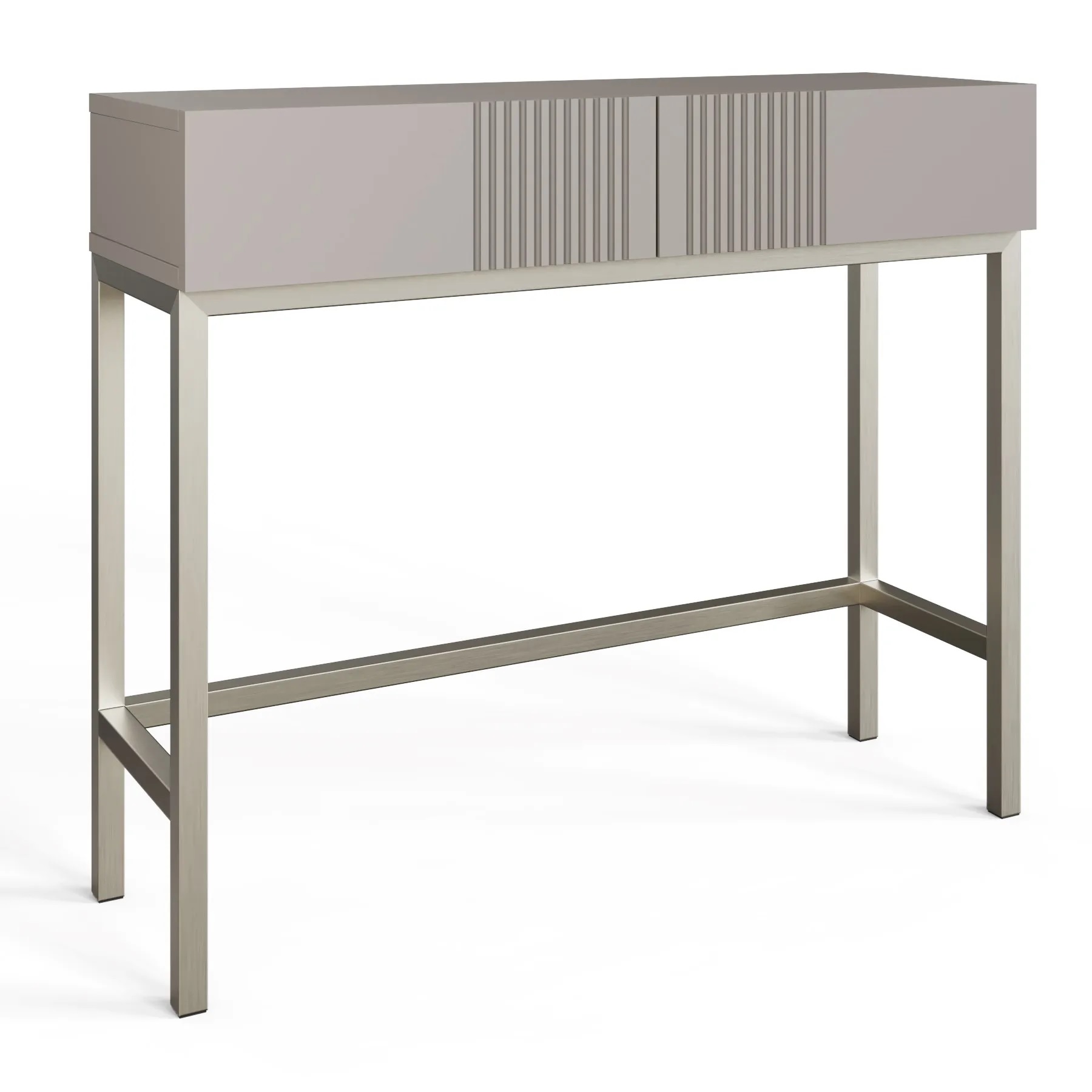 Beautiful two drawer console table with a subtle fluted design and striking mink toned brushed nickel legs. This versatile multi-room piece (with room for a chair underneath) can be used for storing keys, magazines or cosmetics and jewellery.