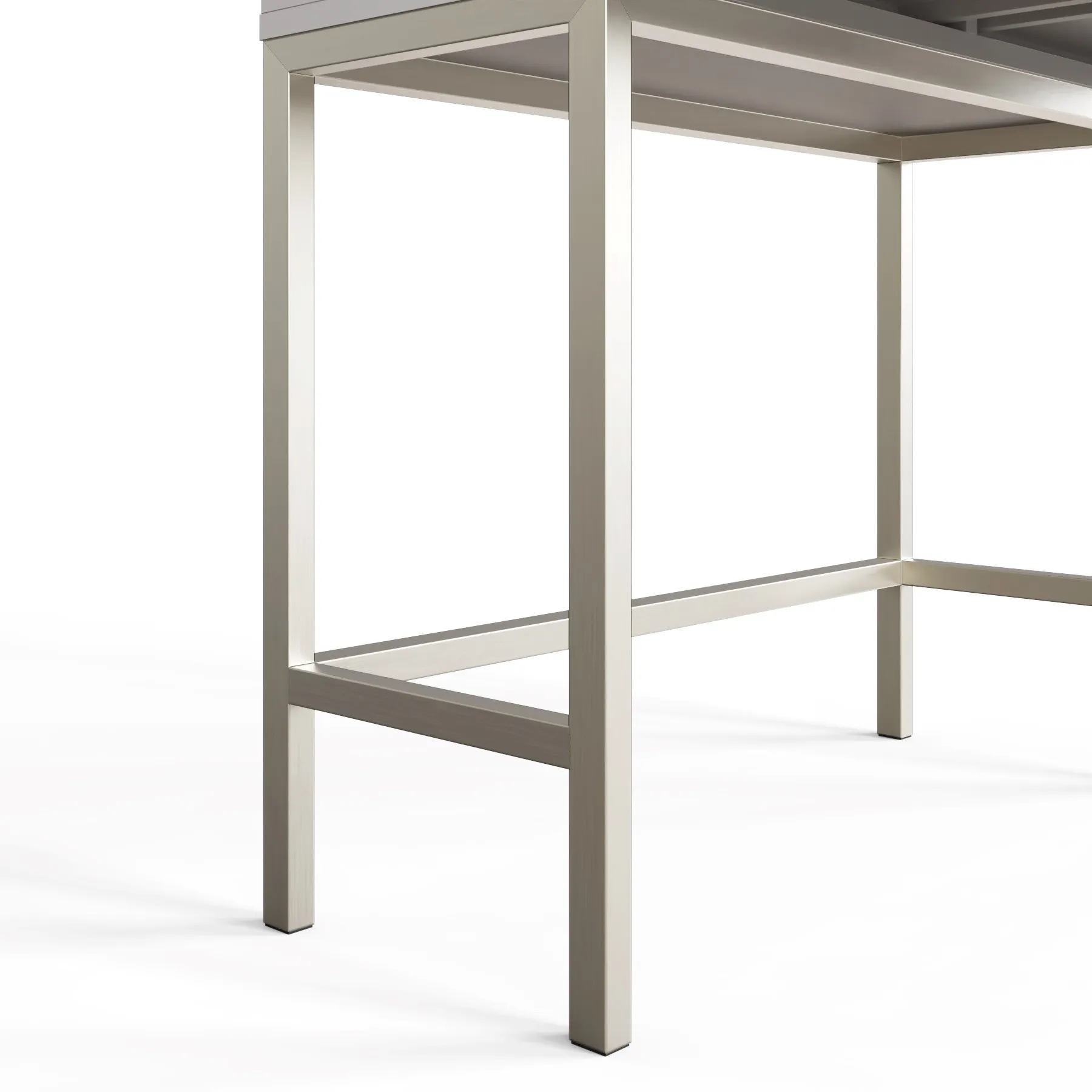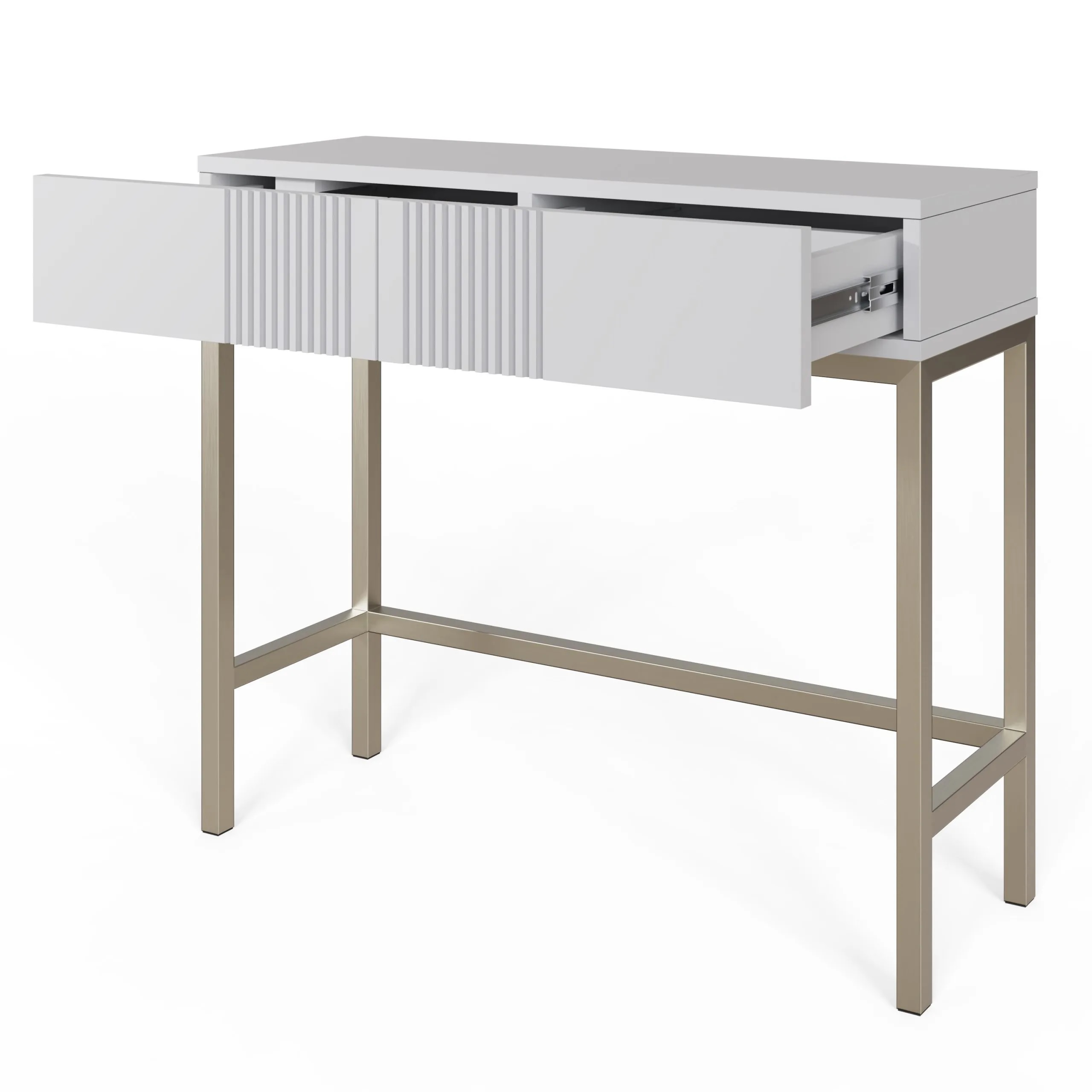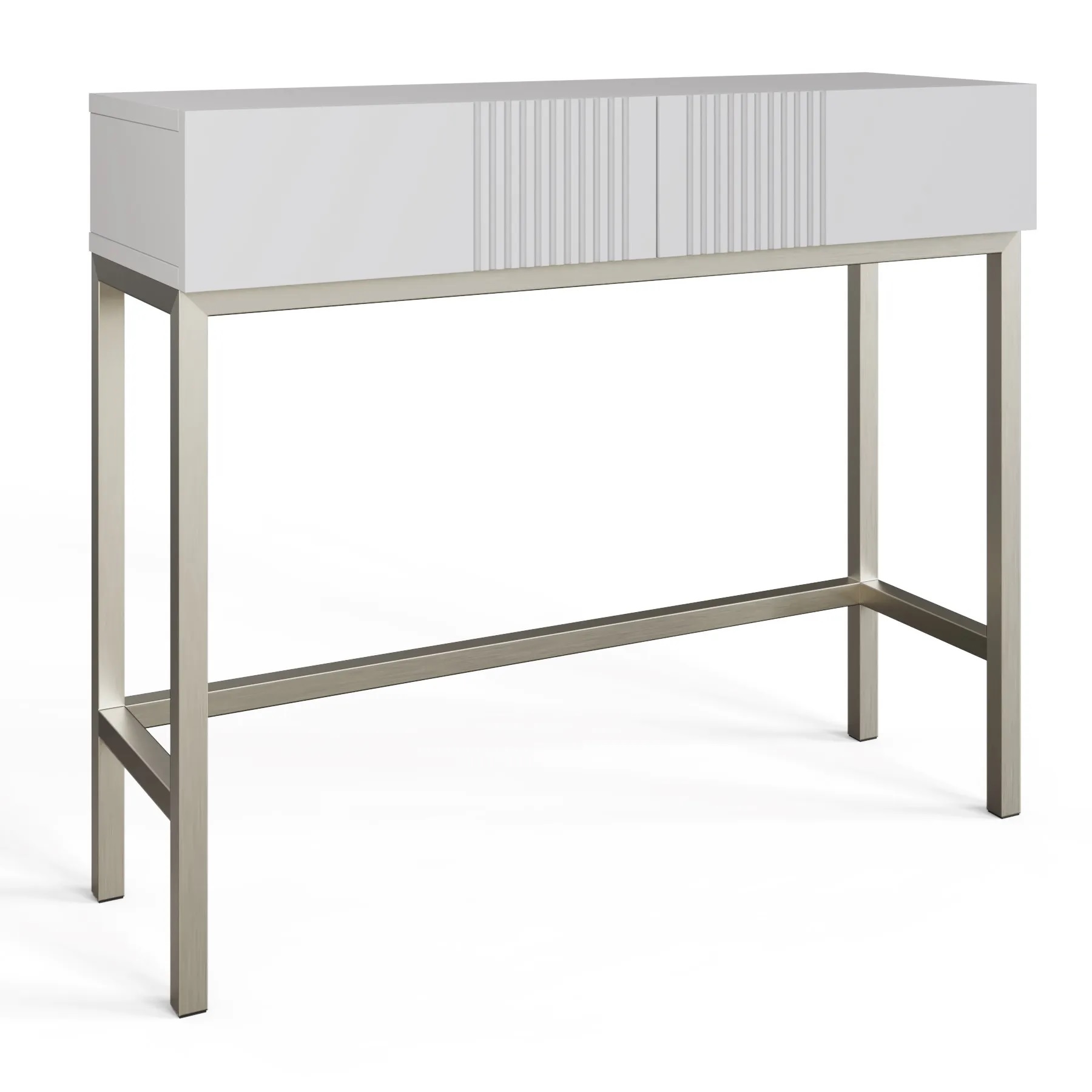 Beautiful two drawer console table with a subtle fluted design and striking mink toned brushed nickel legs. This versatile multi-room piece (with room for a chair underneath) can be used for storing keys, magazines or cosmetics and jewellery.