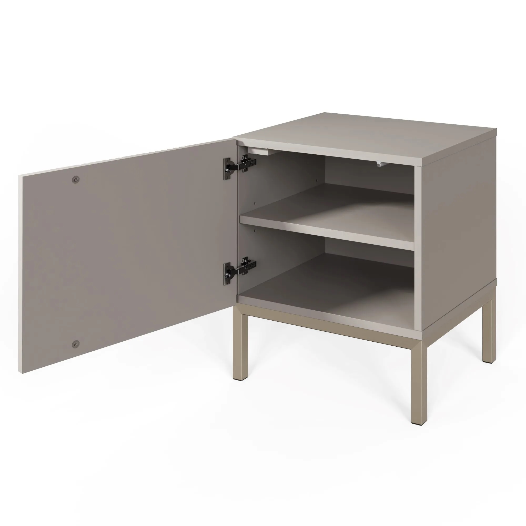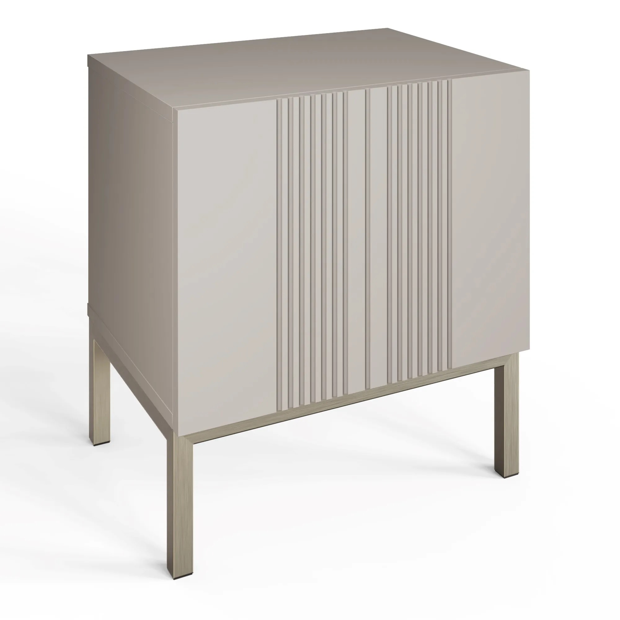 Beautiful one door side table with a subtle fluted design and striking mink toned brushed nickel legs. This versatile piece, suitable for a living room or as a bedside table has ample storage.