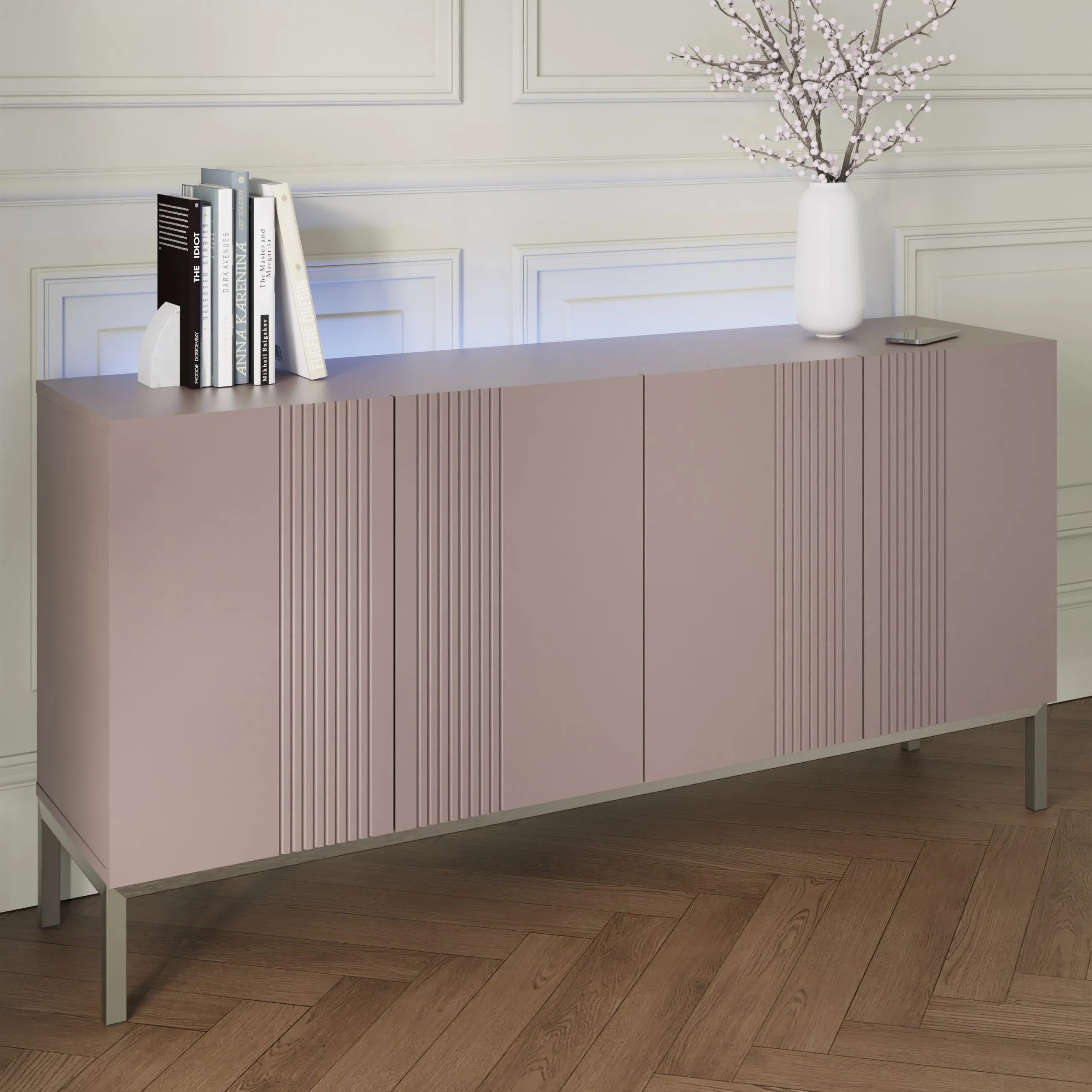 Beautiful four door sideboard, with a subtle fluted design and striking brushed nickel finish legs. The elegant exterior extends within, offering extensive storage space for tableware, glassware, and linens, perfect for a living or dining room.