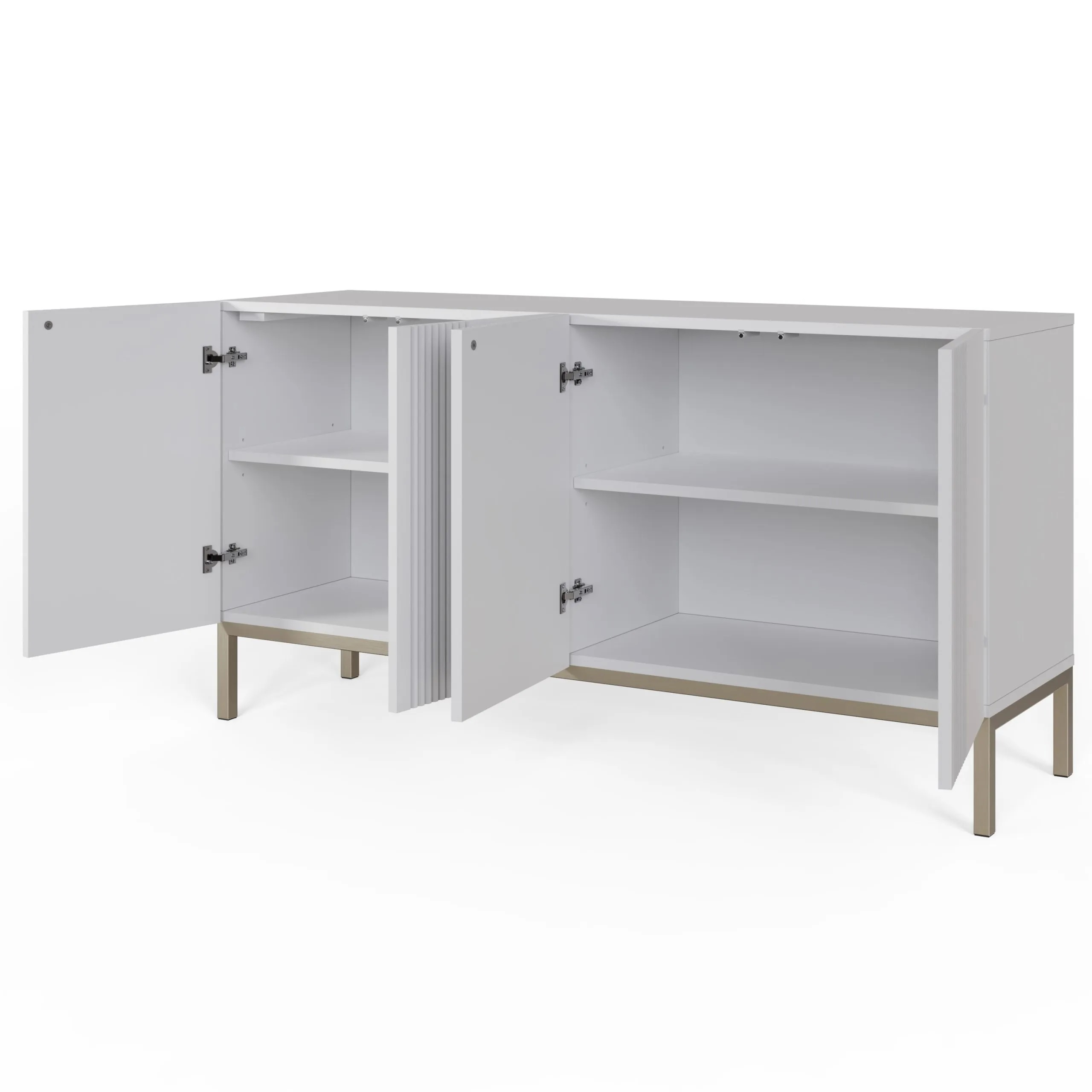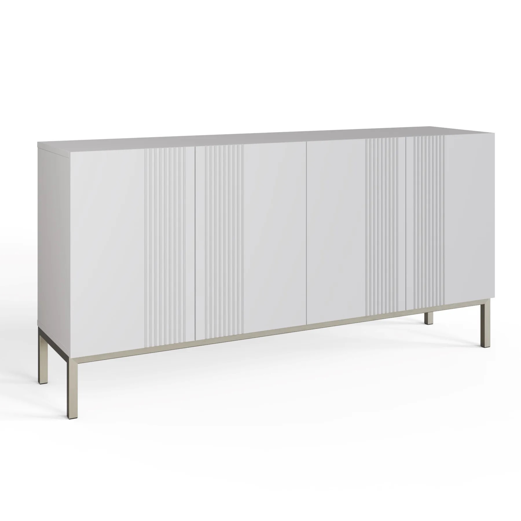 Beautiful four door sideboard, with a subtle fluted design and striking brushed nickel finish legs. The elegant exterior extends within, offering extensive storage space for tableware, glassware, and linens, perfect for a living or dining room.