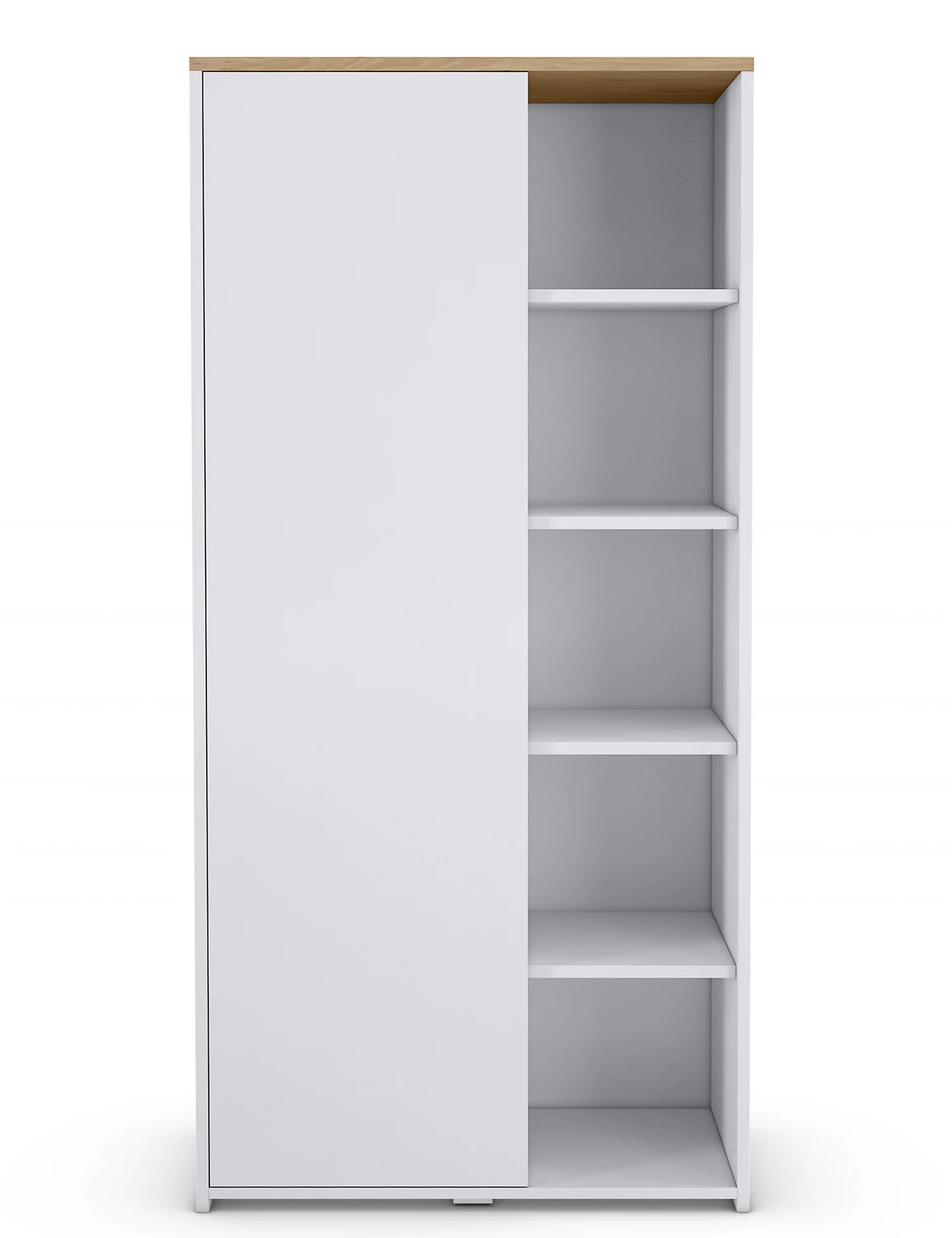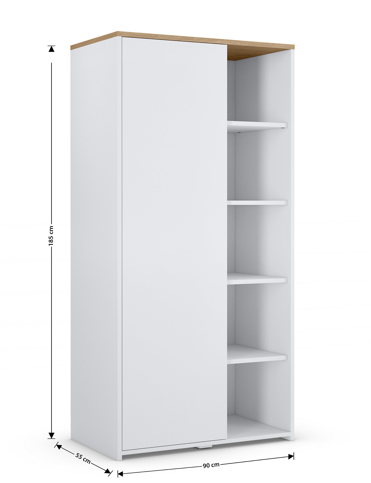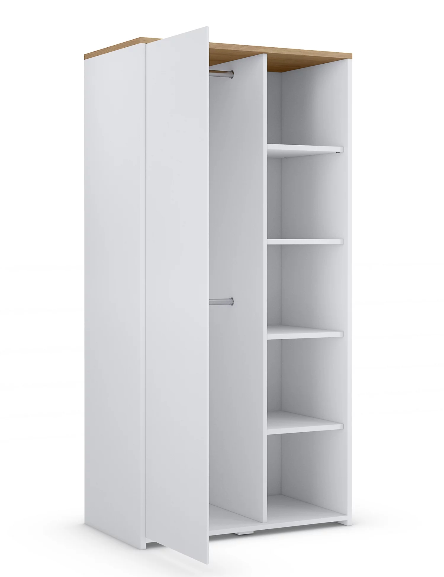 This double wardrobe provides ample bedroom storage and fits into any setting with its simple design and wood-effect finish. One side has enclosed hanging space, while the other has open shelving, making it a versatile homeware addition. Matching pieces available.