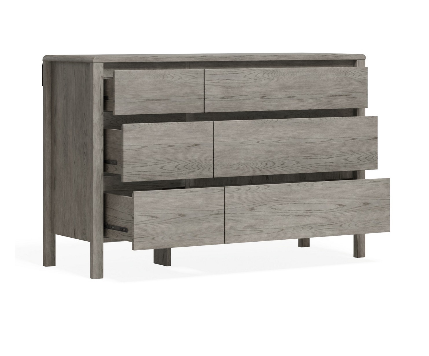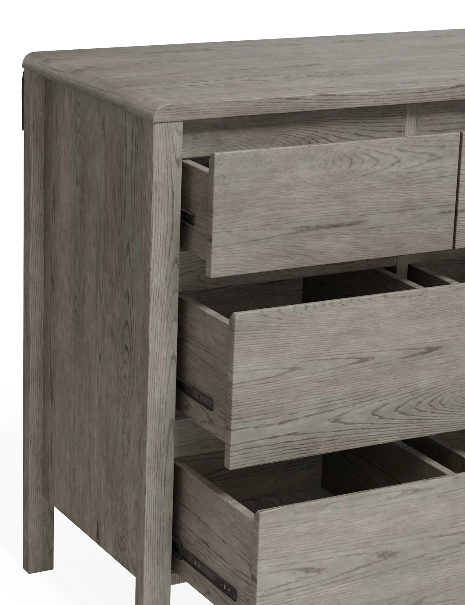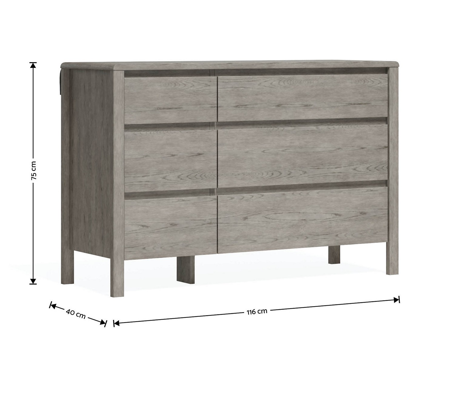 This six-drawer chest from the Loxton range provides optimal storage for your bedroom. With its handy combination of smaller and larger drawers, it lets you easily organise your clothing, underwear and more. It has a loft-style wood-effect finish, and with its grooved handles and curved edges, this modern piece of furniture delivers a sleek look to your décor.