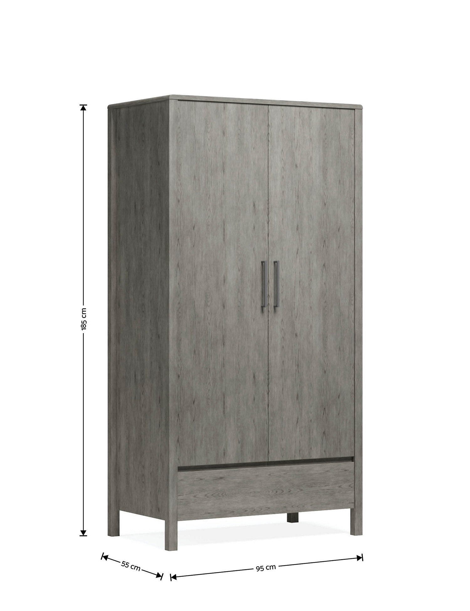 Clean lines and minimal detailing give this Loxton wardrobe a contemporary vibe. This double-door design has plenty of storage room and a rail inside as well as a drawer at the bottom. Smooth curved edges deliver a soft look, while slimline chrome handles complement its ash wood effect.