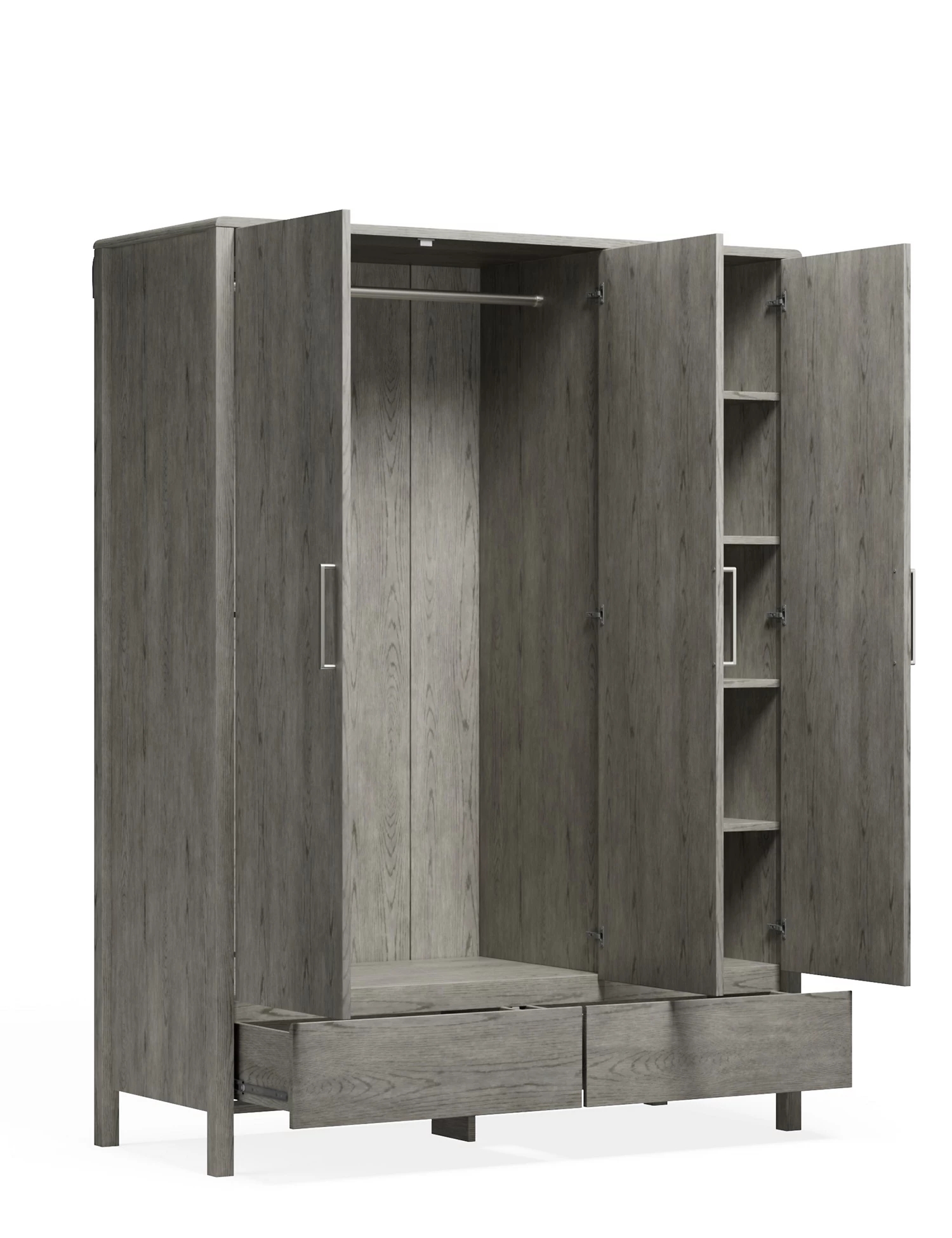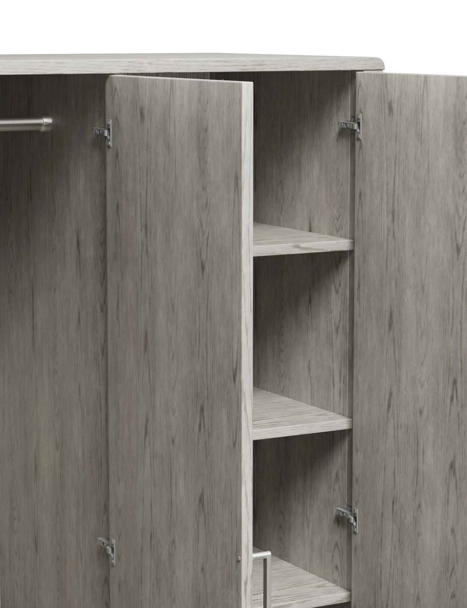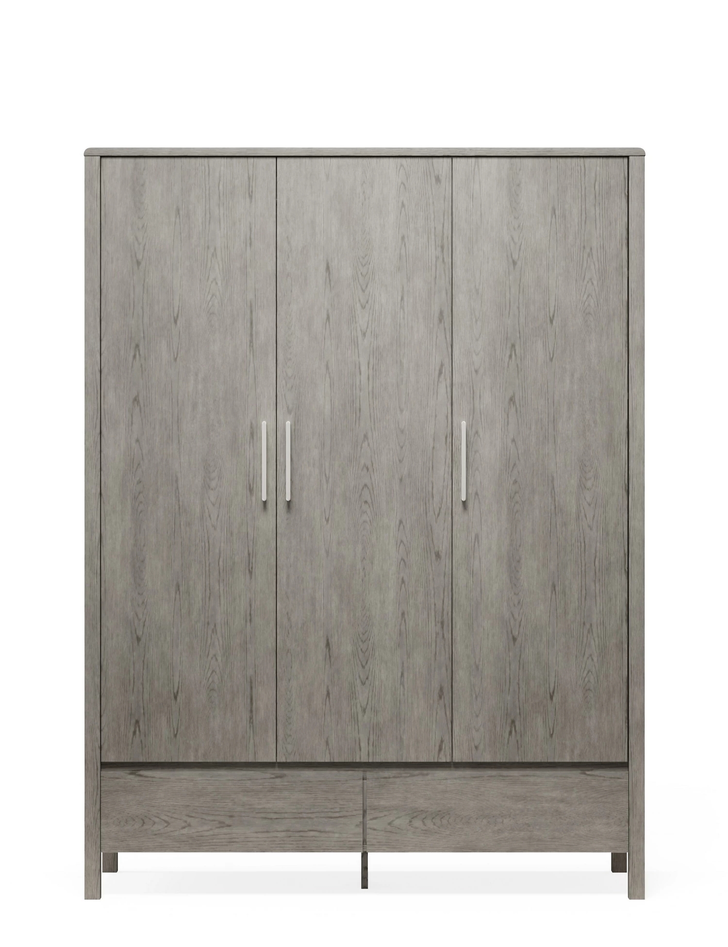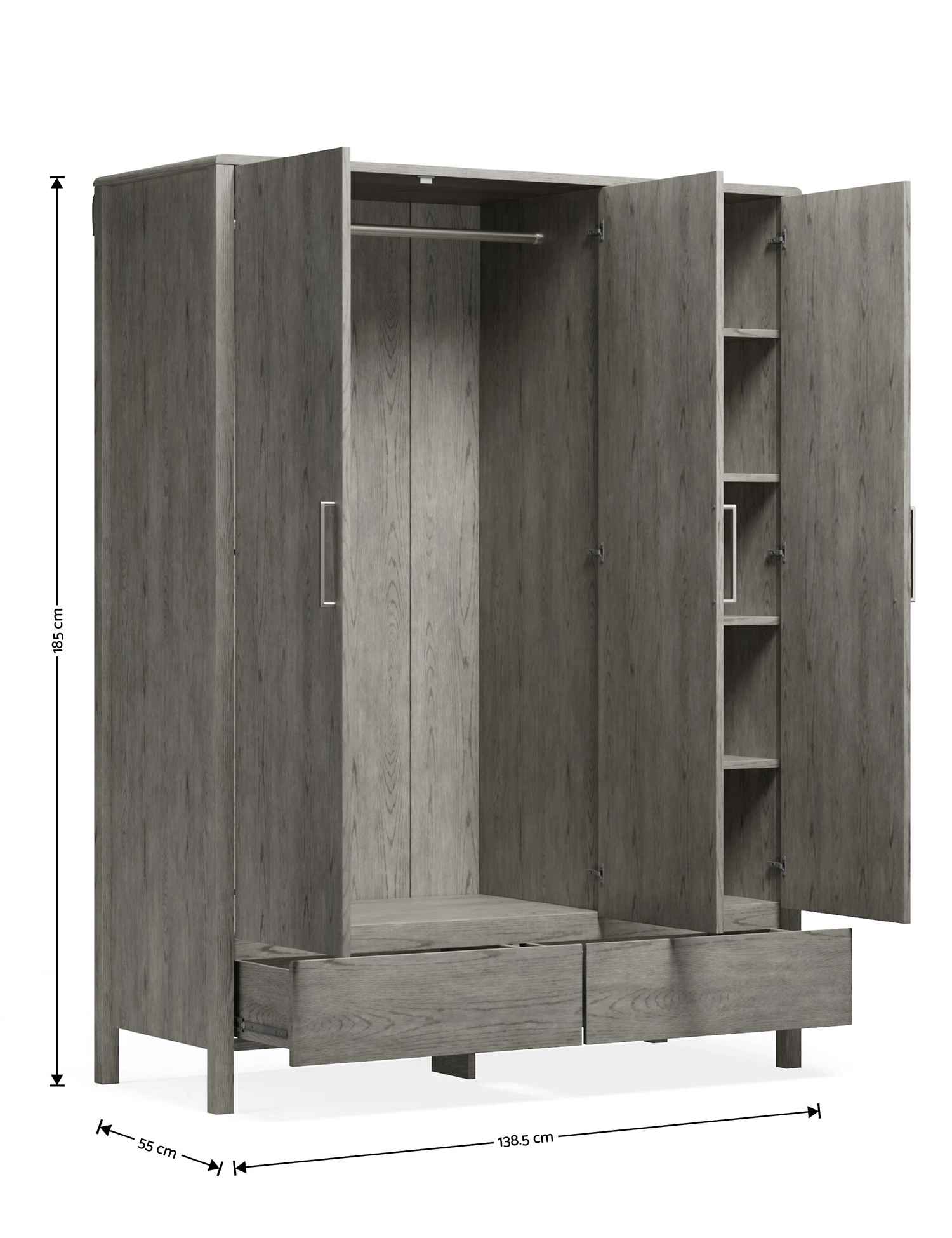 Stylish meets practical with this triple wardrobe from the Loxton range. The generous double-width hanging area is complemented by shelves behind the third door, adding storage for foldable items. Brushed metal vertical bar handles give a neat and contemporary feel. Underneath, sleek drawers mounted on metal runners make the most of every inch of space. Matching pieces are available.