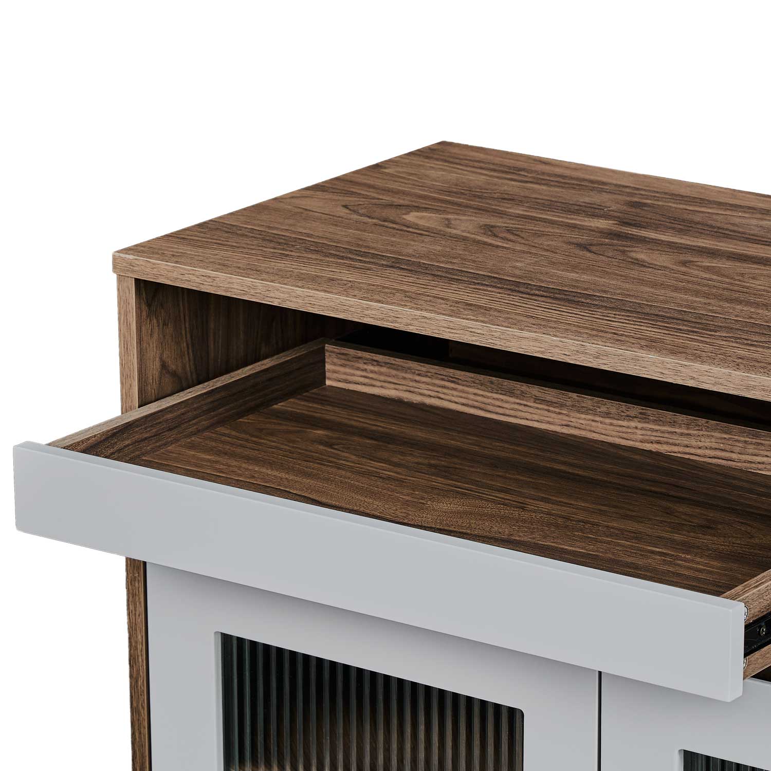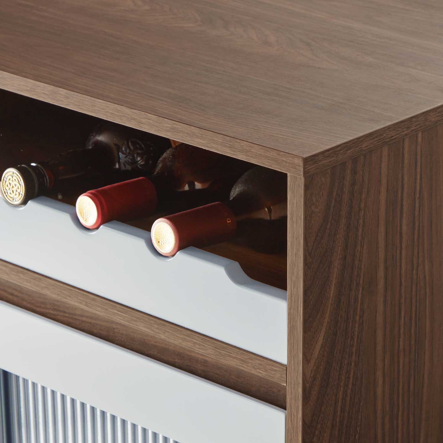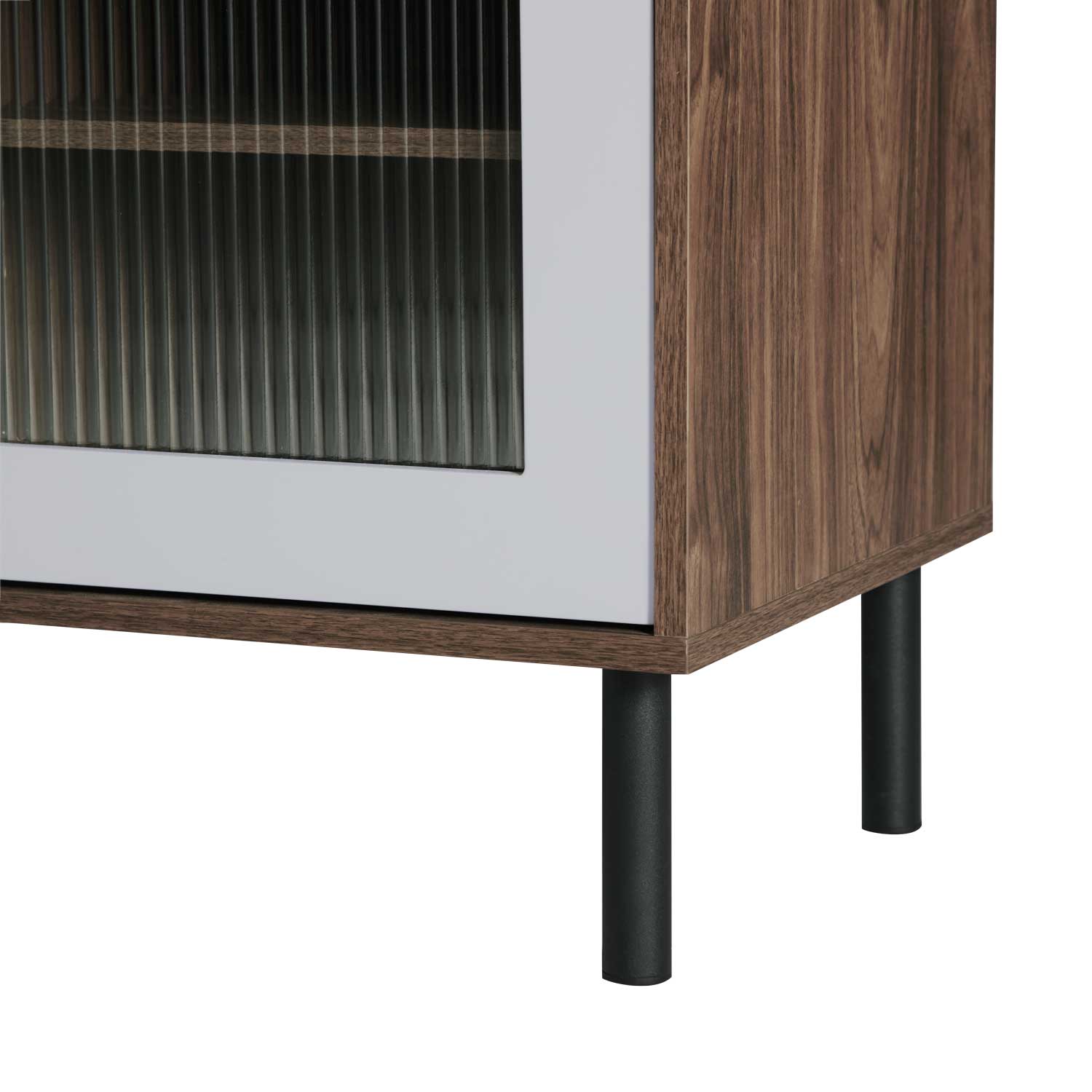 Oreo sideboard has 3 doors, a tray and a wine rack configuration, which provides multiple functions. The wave effect tempered glass adds extra elegance to it. The round slim metal leg allows plenty space to clean underneath floor.