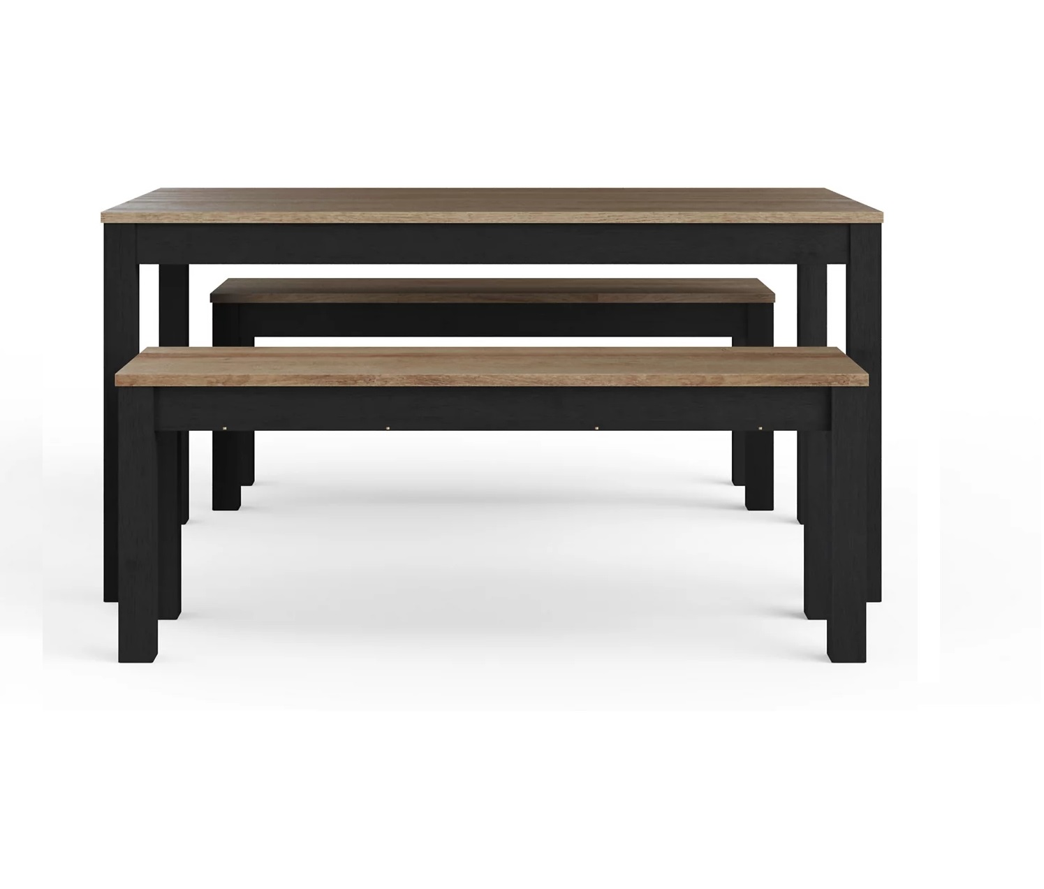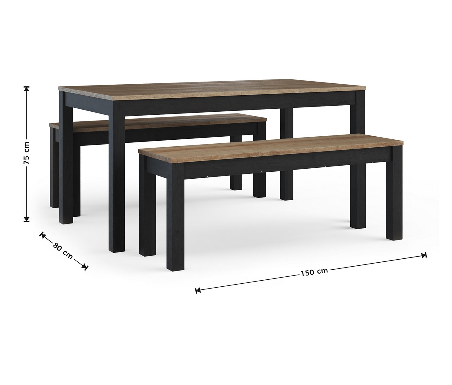 Create a space perfect for socialising with this dining table and benches set from our Salcombe range. This modern set is made from responsibly sourced wood and features contrast legs for an eye-catching finish. Seats up to six people.