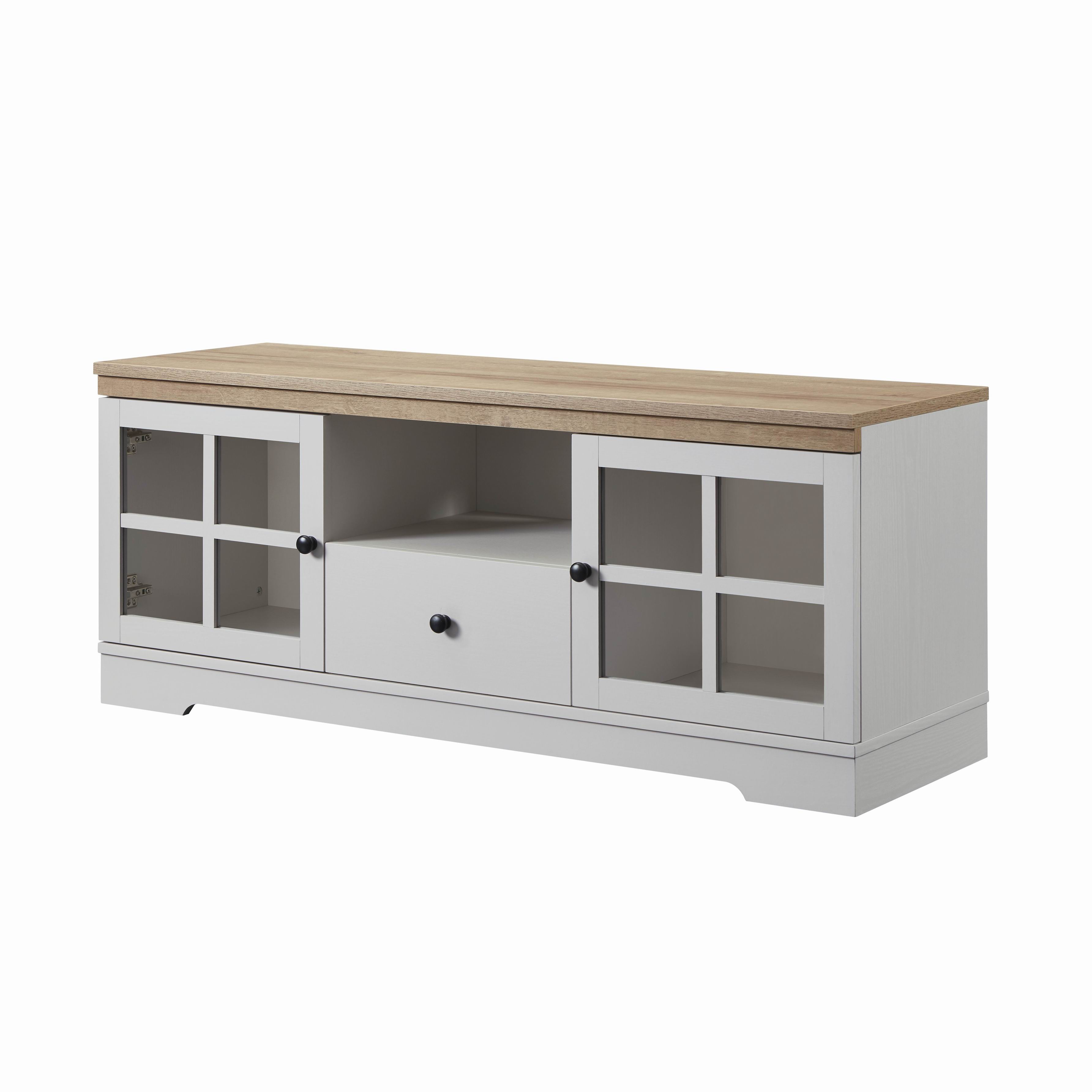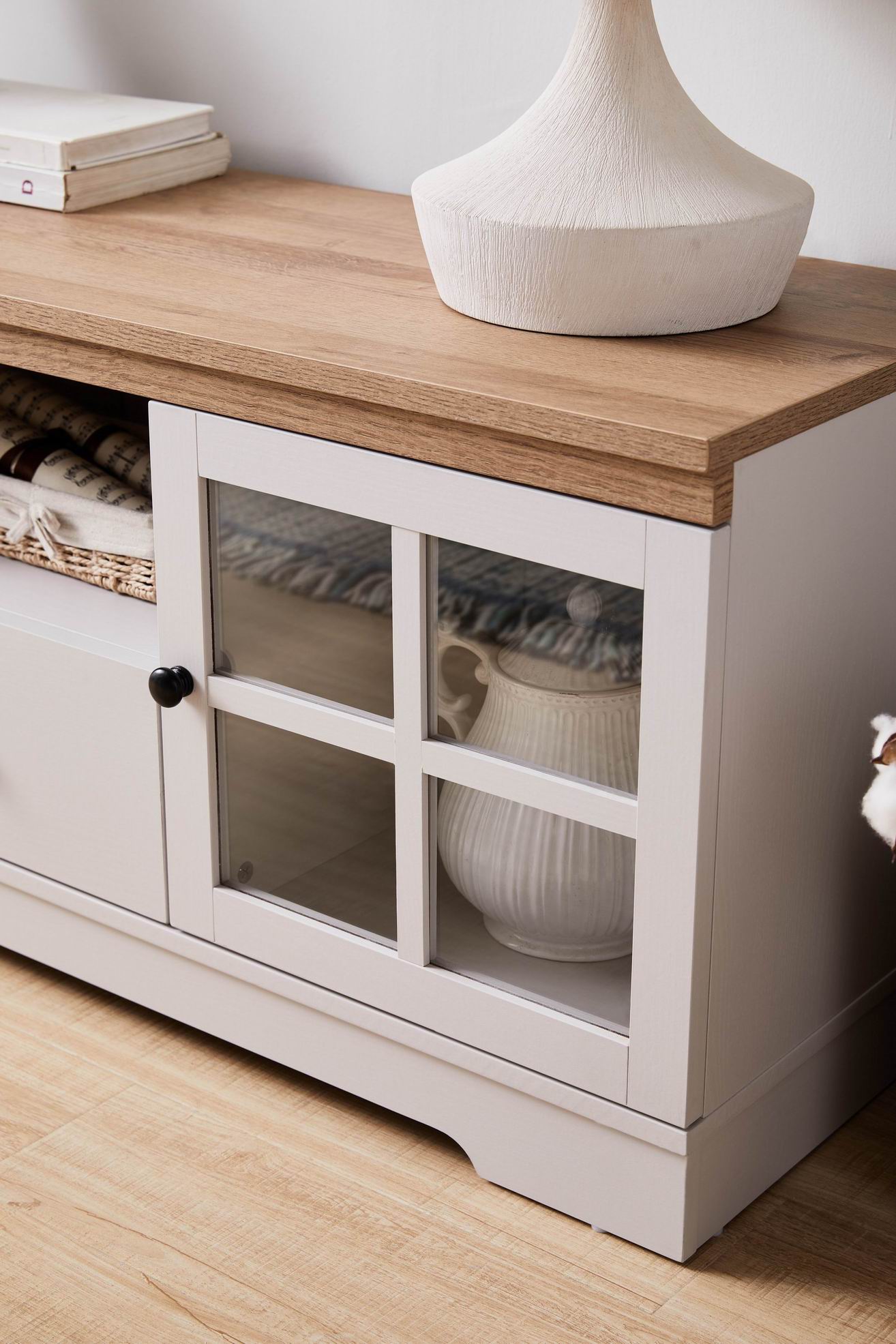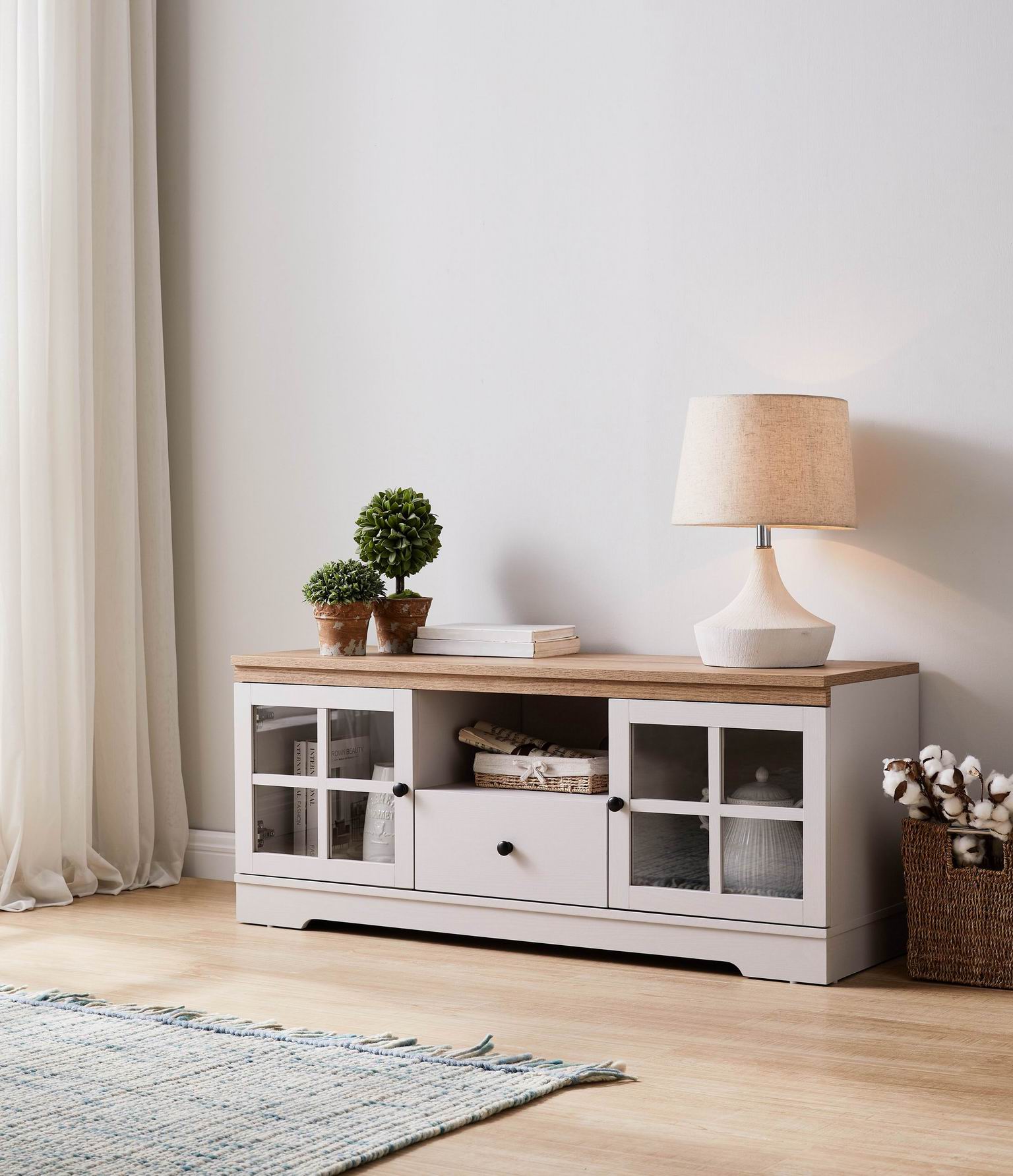 Modern oak effect finish and contrasting light grey body, easy to assemble and clean, also features plenty of storage space behind the two windowed doors, in the drawer, and on the shelf.